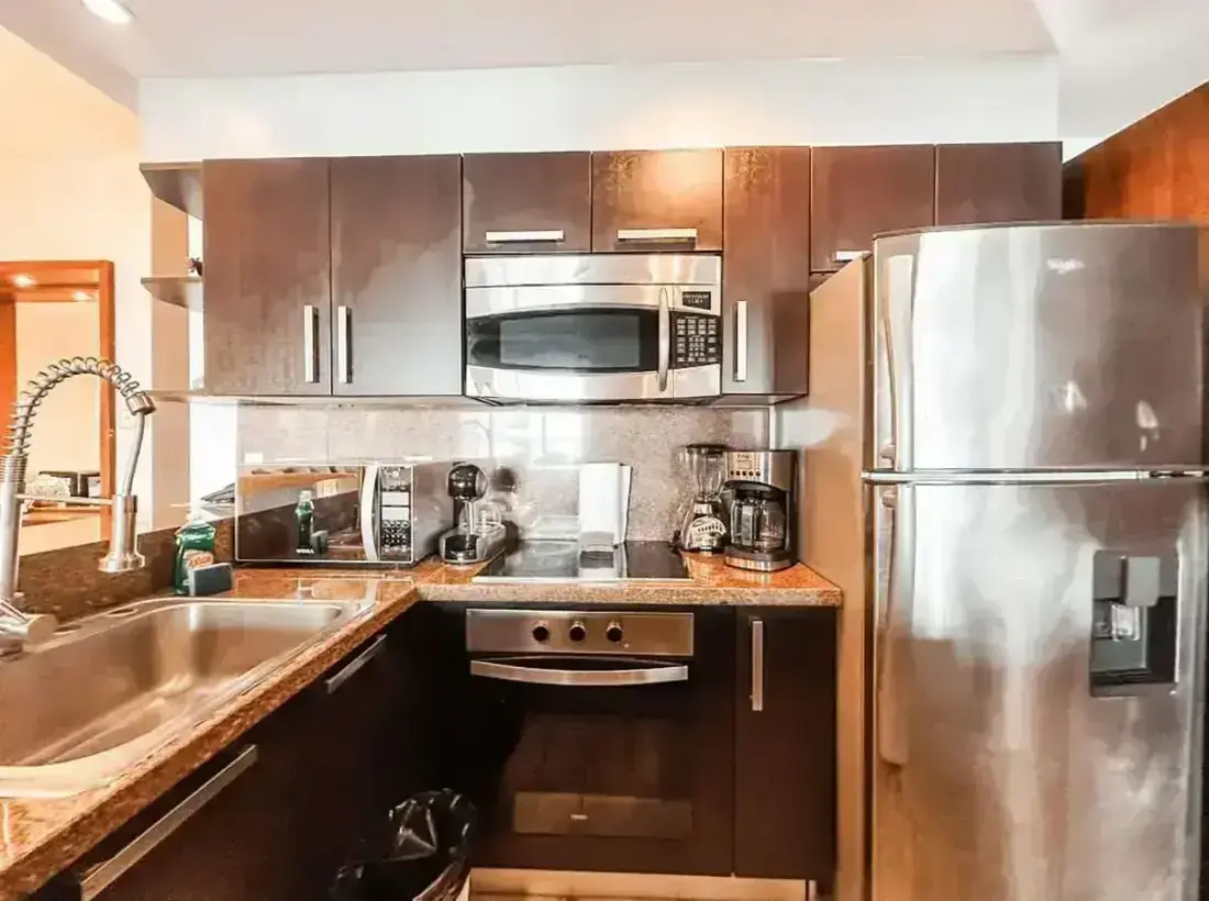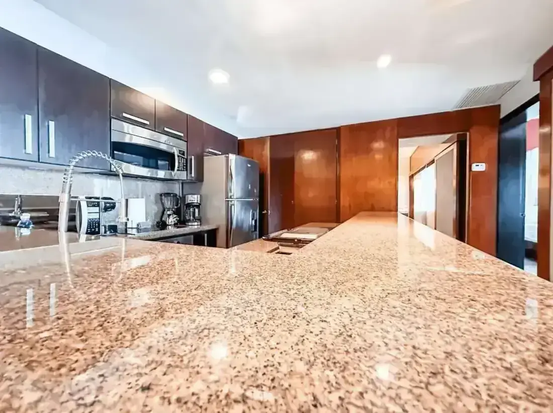- Fully equipped kitchen (granite countertops, marble floors, refrigerator, stove, microwave, toaster, blender, coffee maker)