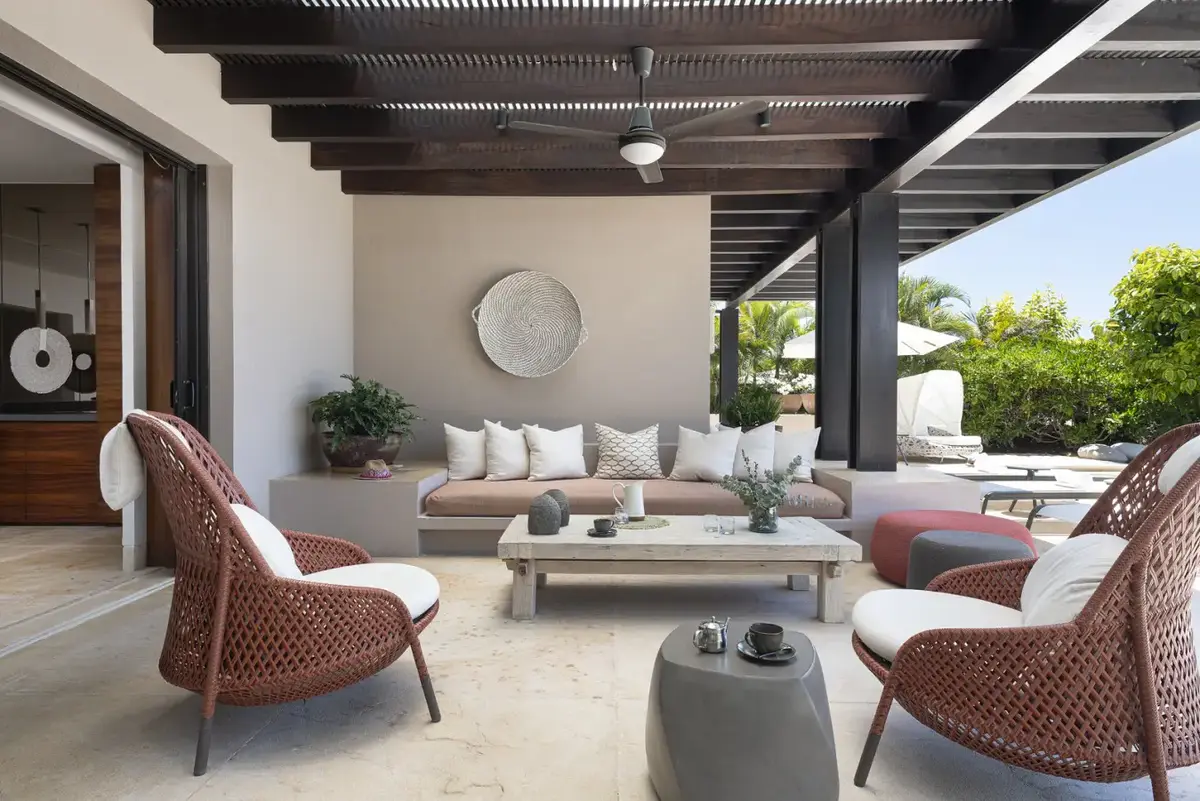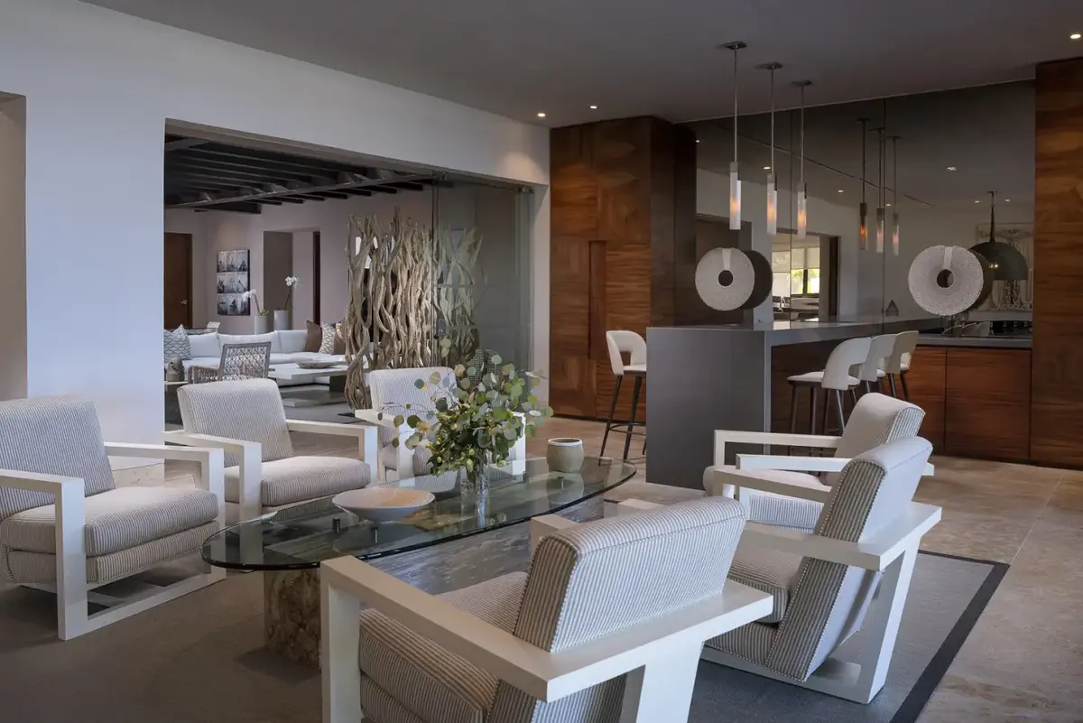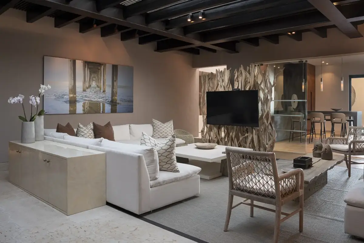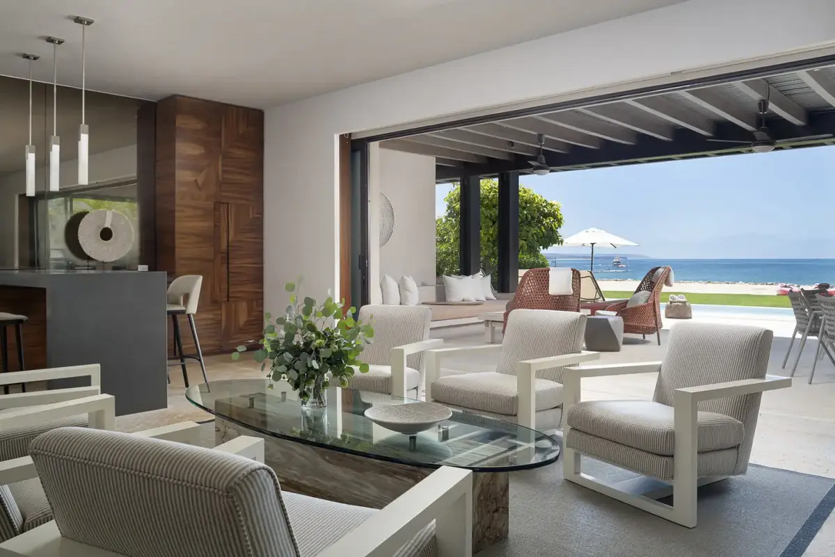 - Sophisticated living room with vaulted ceilings, ocean views, and Mexico-inspired décor