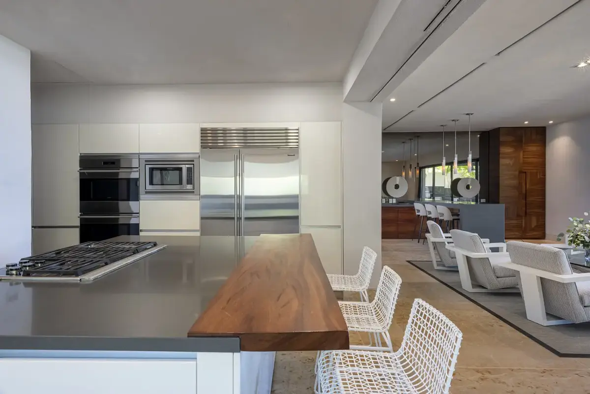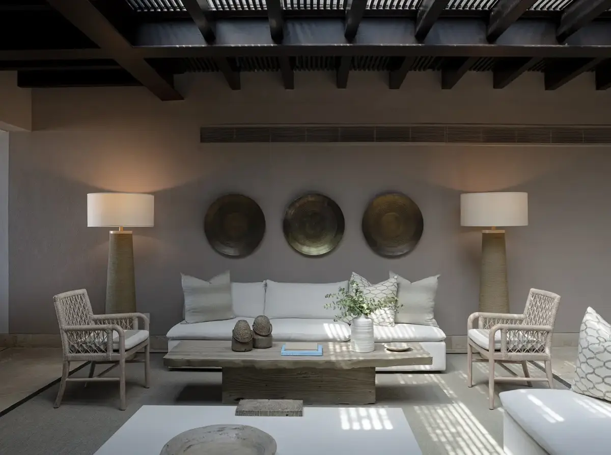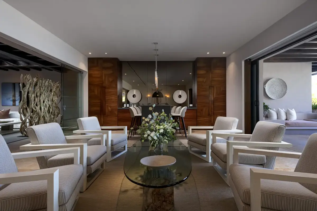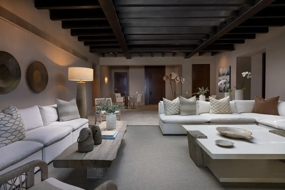 - Sophisticated living room with vaulted ceilings, ocean views, and Mexico-inspired décor