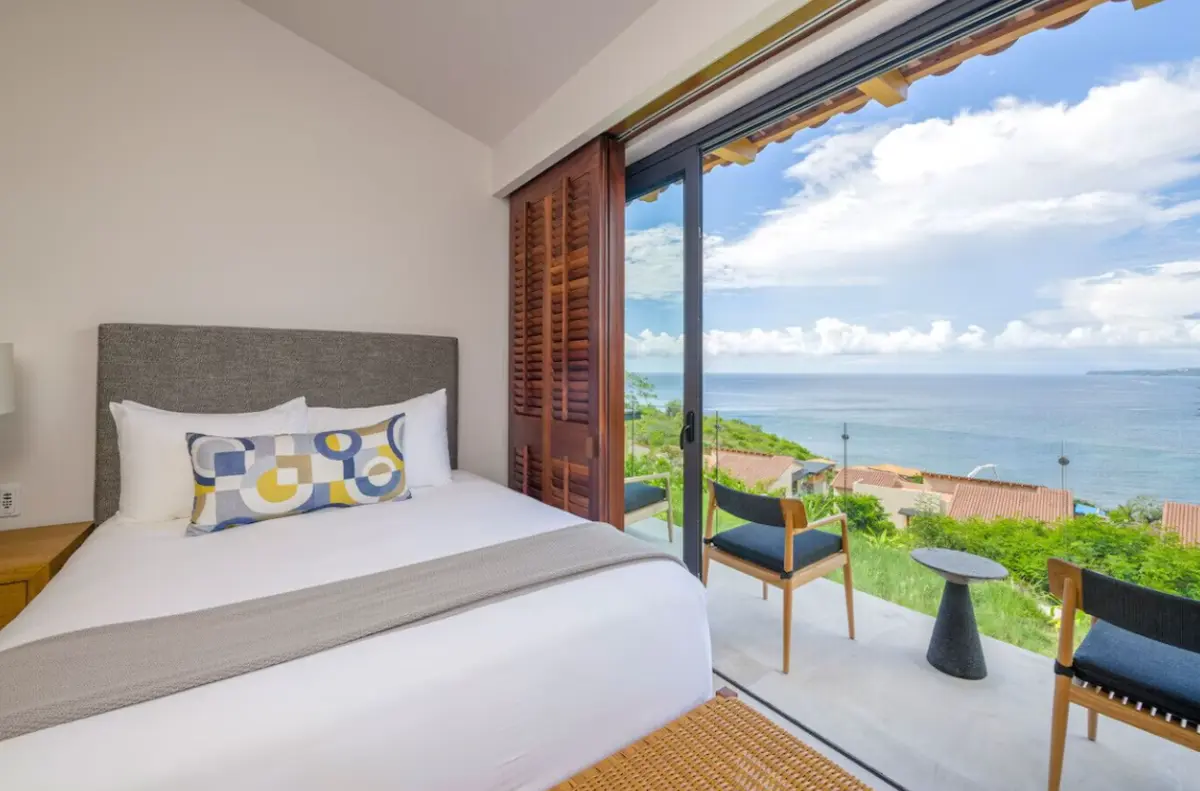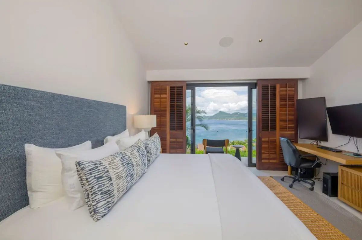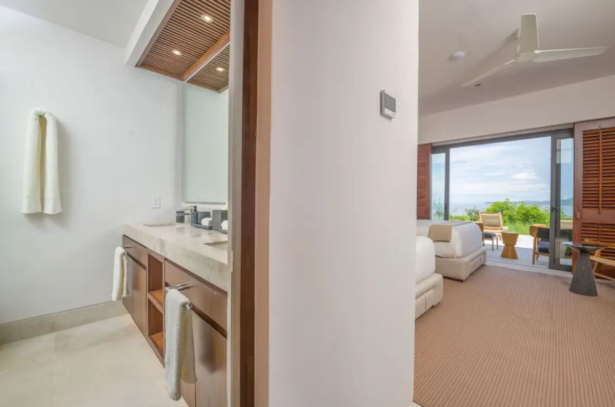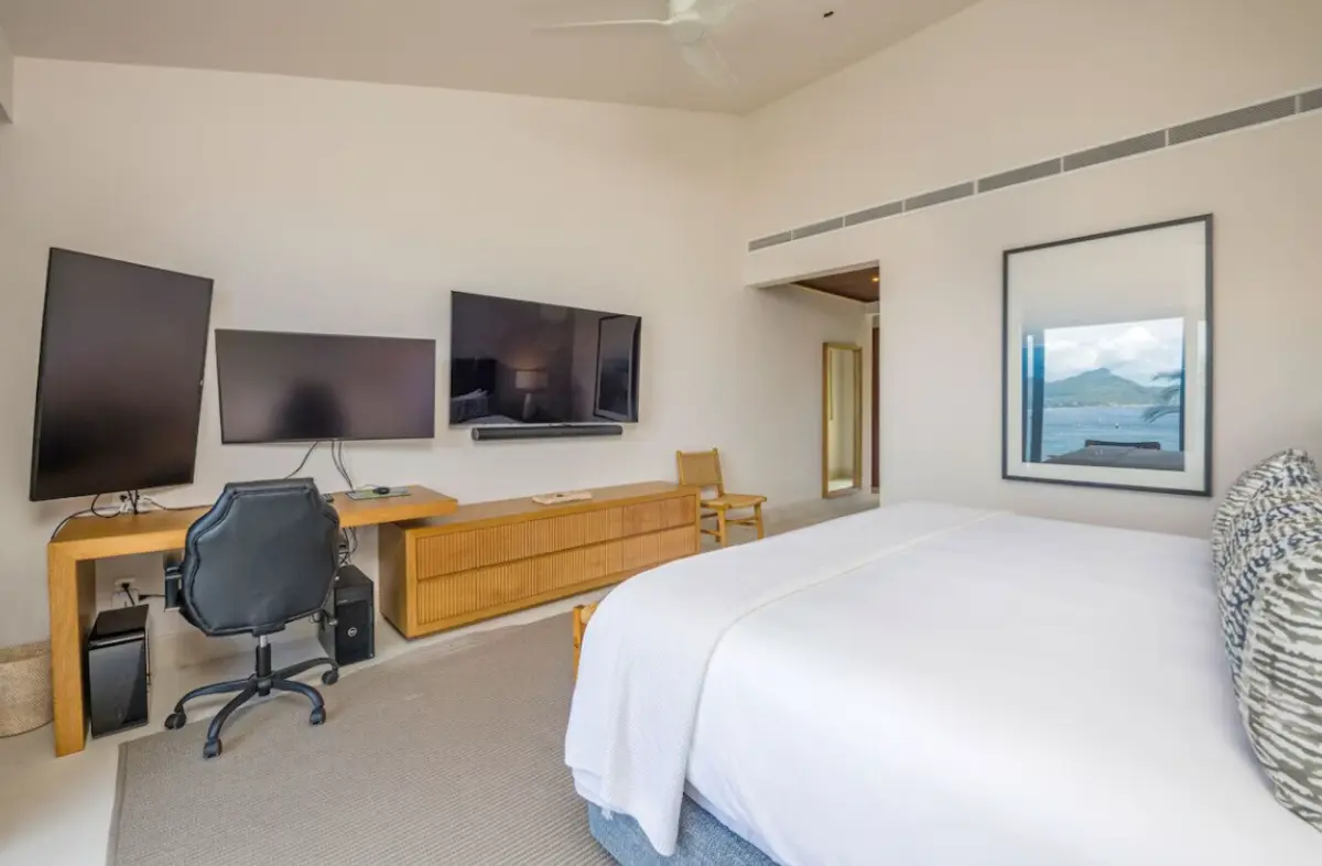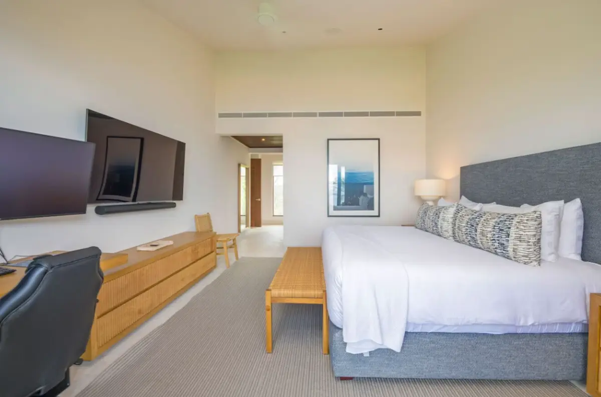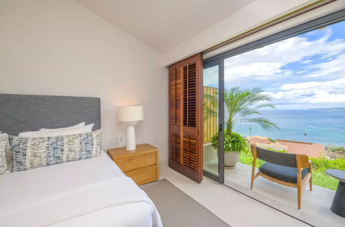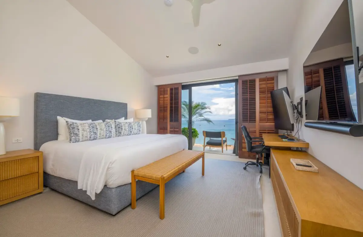• Primary Bedroom – King-size bed, en-suite spa bathroom with tub & double sinks, dedicated workspace, direct access to oceanview patio
