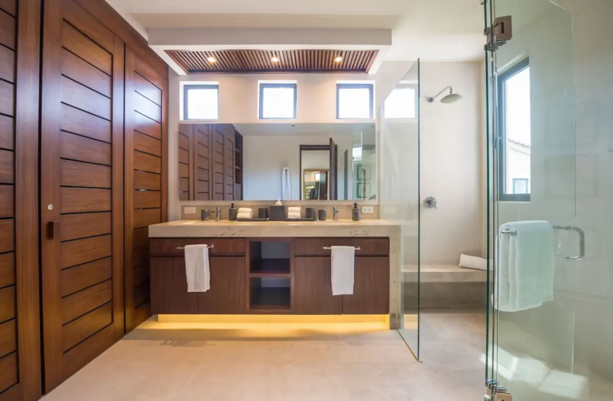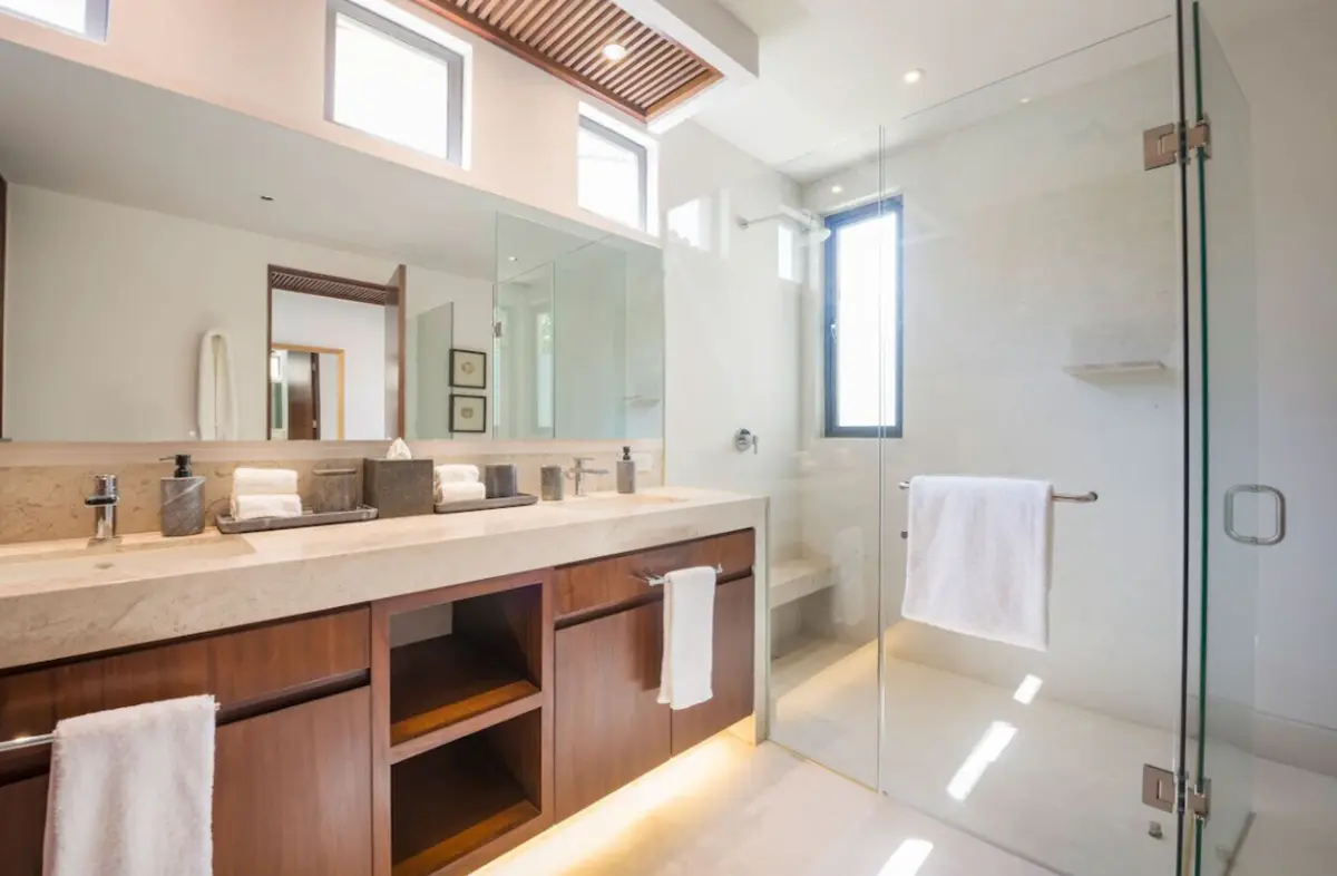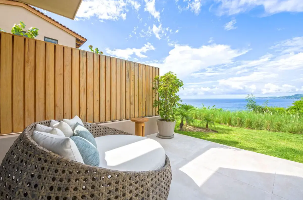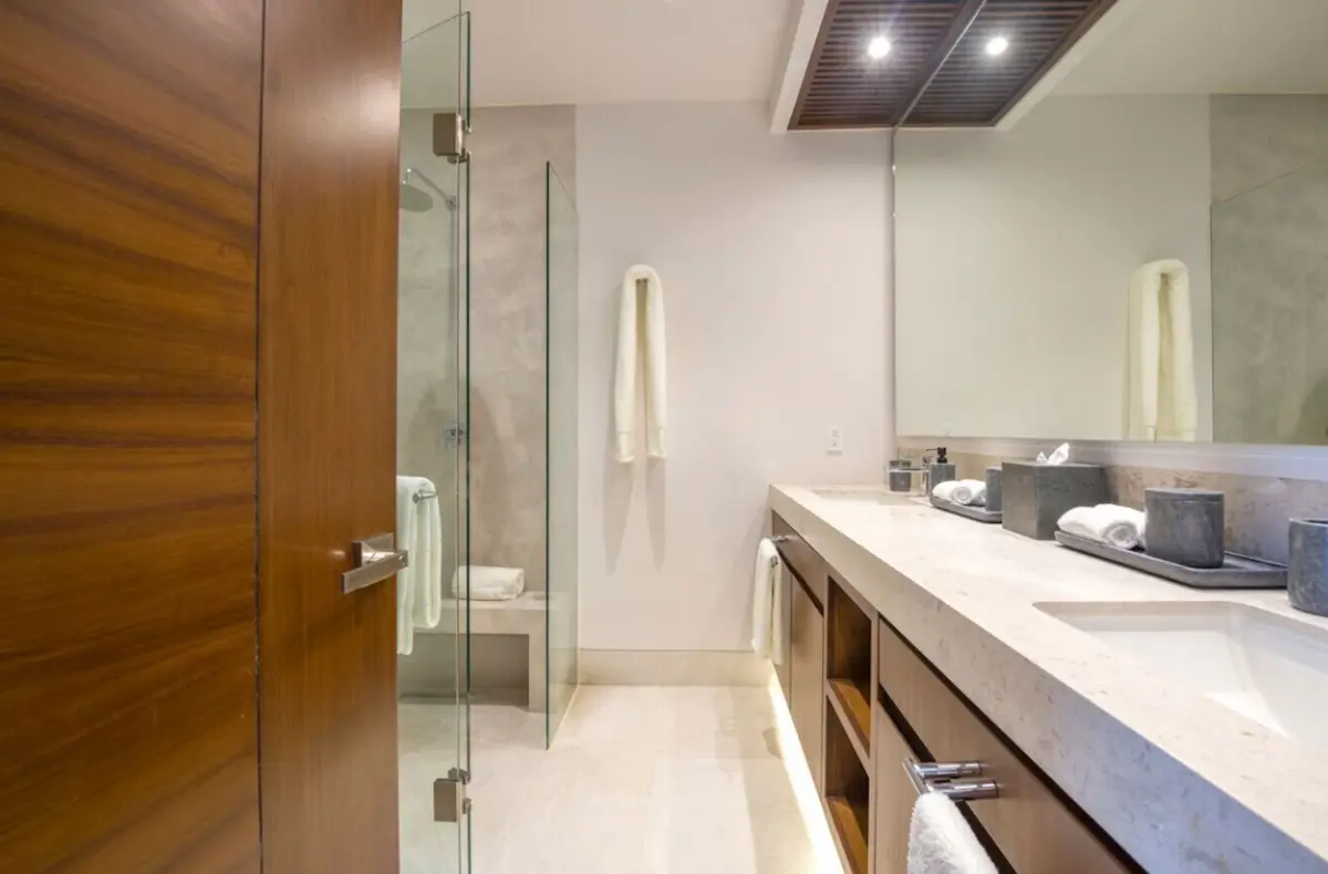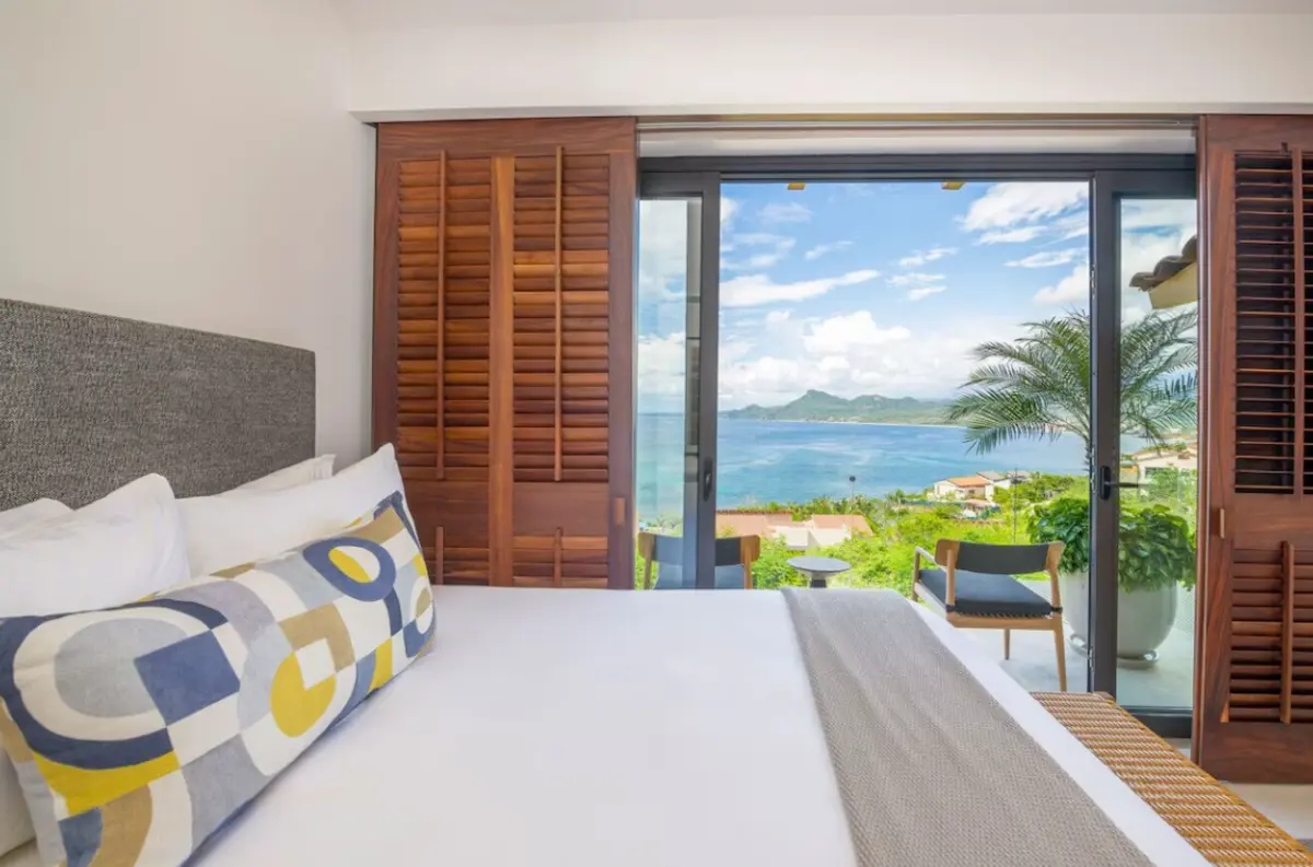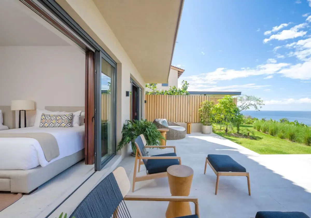 • Primary Bedroom – King-size bed, en-suite spa bathroom with tub & double sinks, dedicated workspace, direct access to oceanview patio