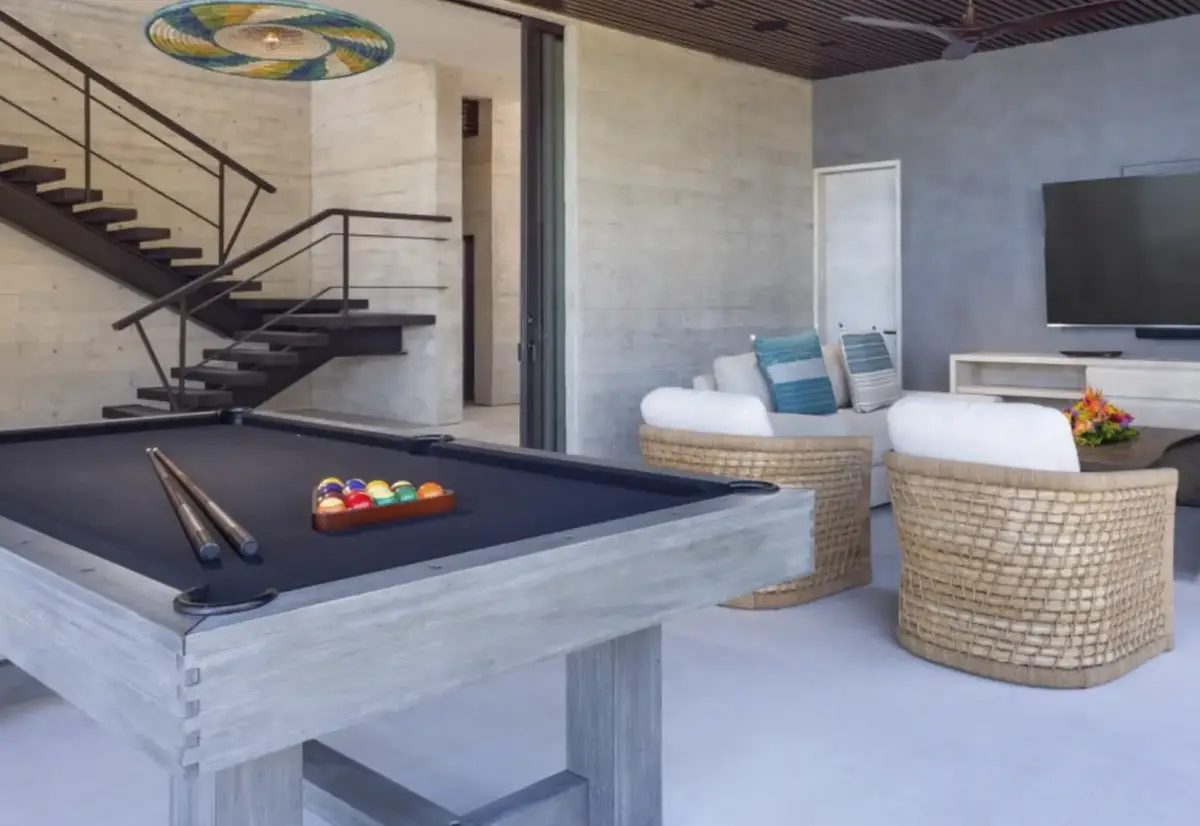 The Residence The villa is an entertainment powerhouse, featuring a lower-level game room with pool and ping-pong tables, and a high-tech media room for cinematic nights. The social heart of the home flows seamlessly between the gourmet kitchen and the outdoor “Pizza Grotto.” For wellness seekers, the private fitness center is equipped with a Peloton, elliptical, and free weights, while the infinity pool deck offers multiple fire pits for starlit evening cocktails.