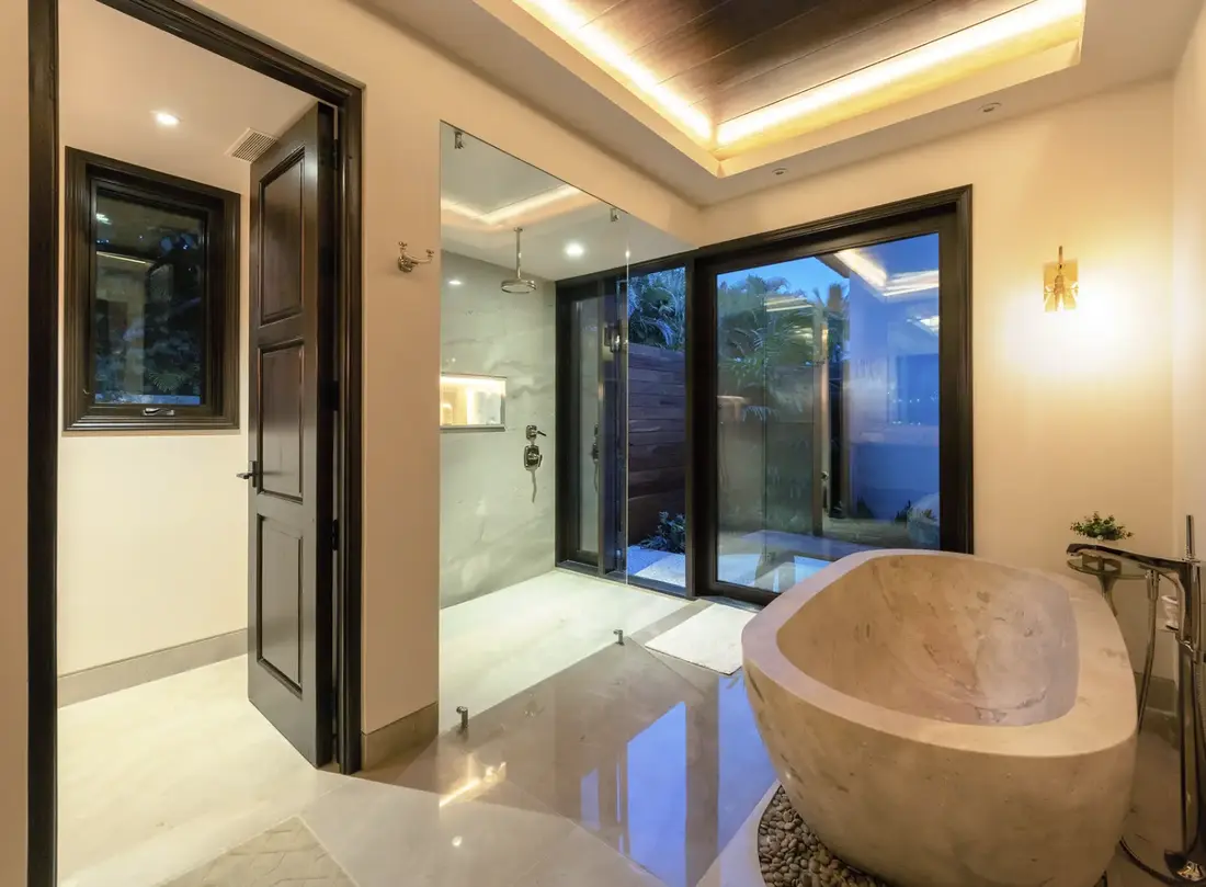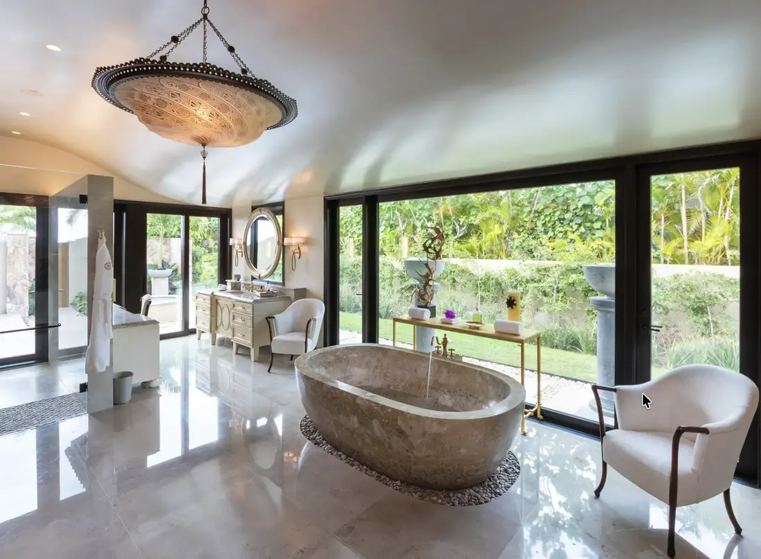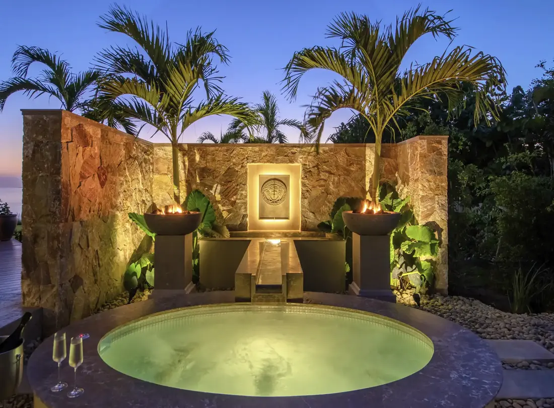 Primary Suite: A palatial enclave with an 85” 8K TV and a private “Moon Garden” featuring a hot tub, waterfall, and fire pots.