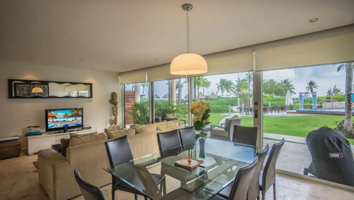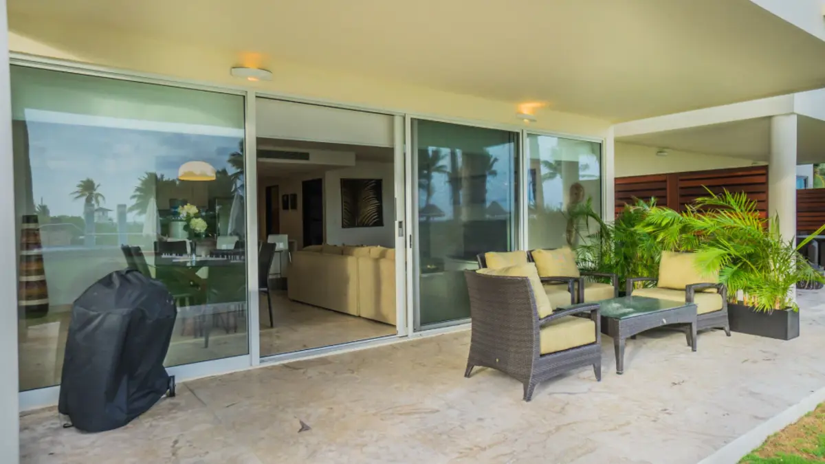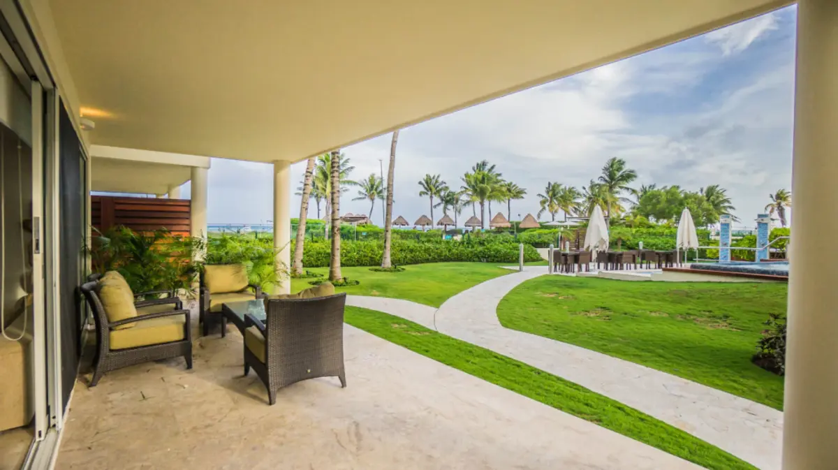 Garden House 21 incites guests to sink back into luxurious comfort with its elegant, dark wood furnishings, modern artwork, plush sectional couch and alluring terrace with sophisticated rattan seating area. This ample outdoor space sits at the front end of the immaculate property and showcases captivating views of the marvelous Caribbean Sea. Its optimal corner location grants guests direct access to the expansive, infinity pool and exclusive beach club across the way, while offering a serene atmosphere in which to savor a good novel or a romantic evening with your loved one.