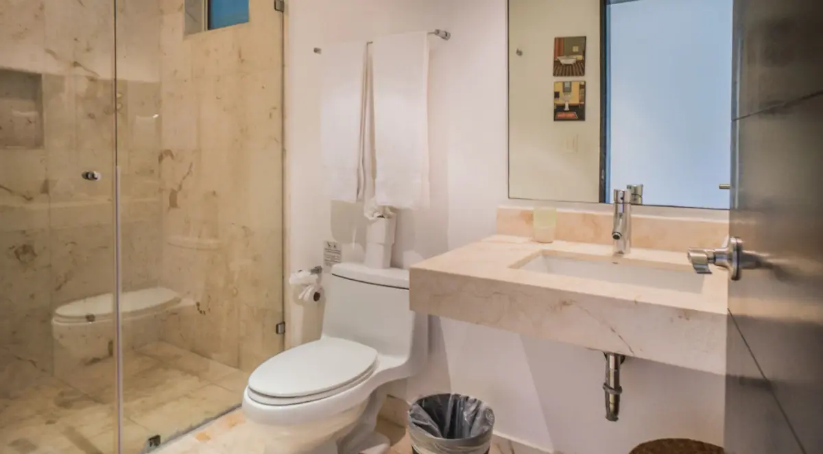 Both commodious bedrooms are professionally decorated and feature 2 double beds in the first with a nearby 3 piece bathroom, and a king size mattress enveloped in high thread count linens in the master. The marble en-suite is equipped with custom closets, a rain shower head, safe, hairdryer and premium organic toiletries.
