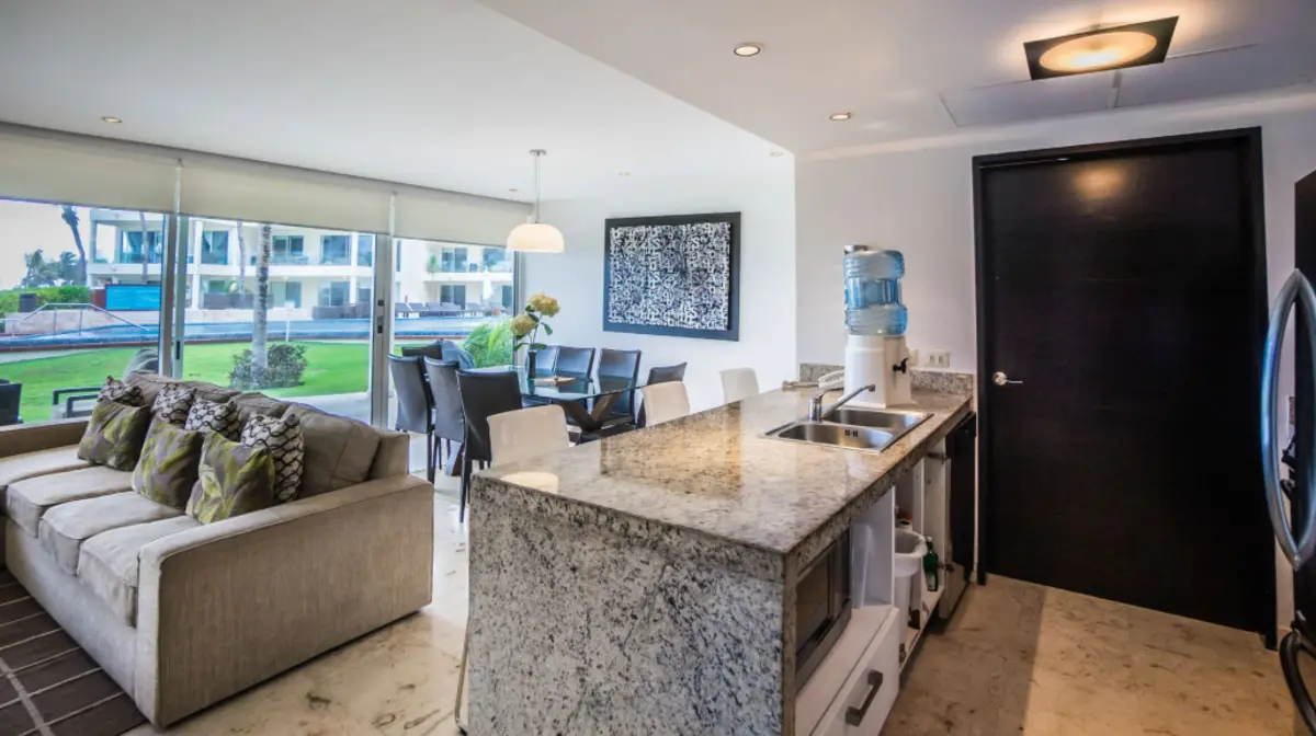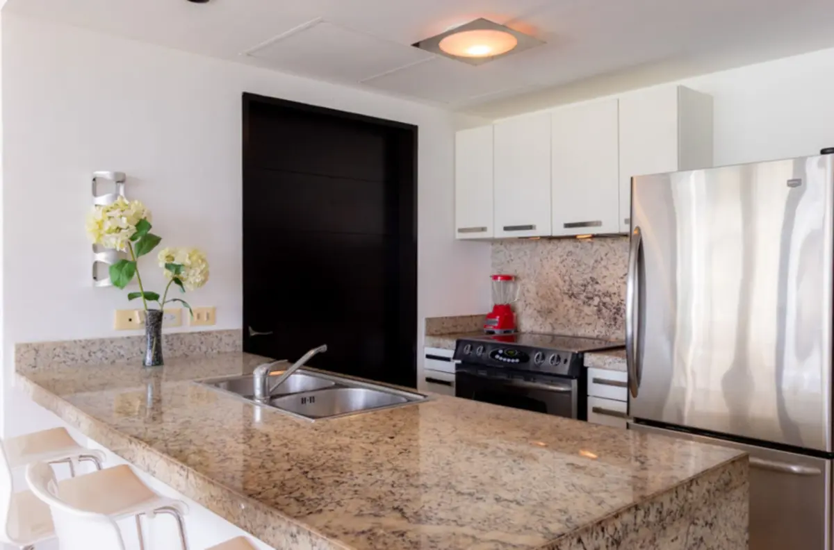 An entire wall of windows allow the glorious sunshine to illuminate the open-concept living space, highlighting the polished, natural stone floors and unique pieces of decor. A gorgeous dining table for 8, a fully-appointed kitchen, a sleek granite breakfast bar which accommodates 3 and a laundry room with washer/dryer are just a few of the aspects guests will appreciate in this paradisaical retreat. Other amenities include flat screen satellite TVs in every room, charcoal grill, iron, cooler, a 24 hour fitness facility and business center, adults-only jacuzzi area, parking and 24 hour security.