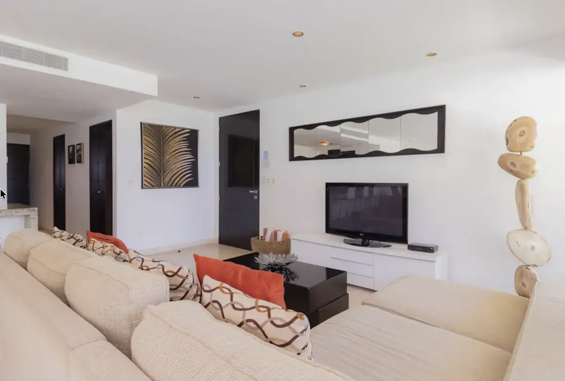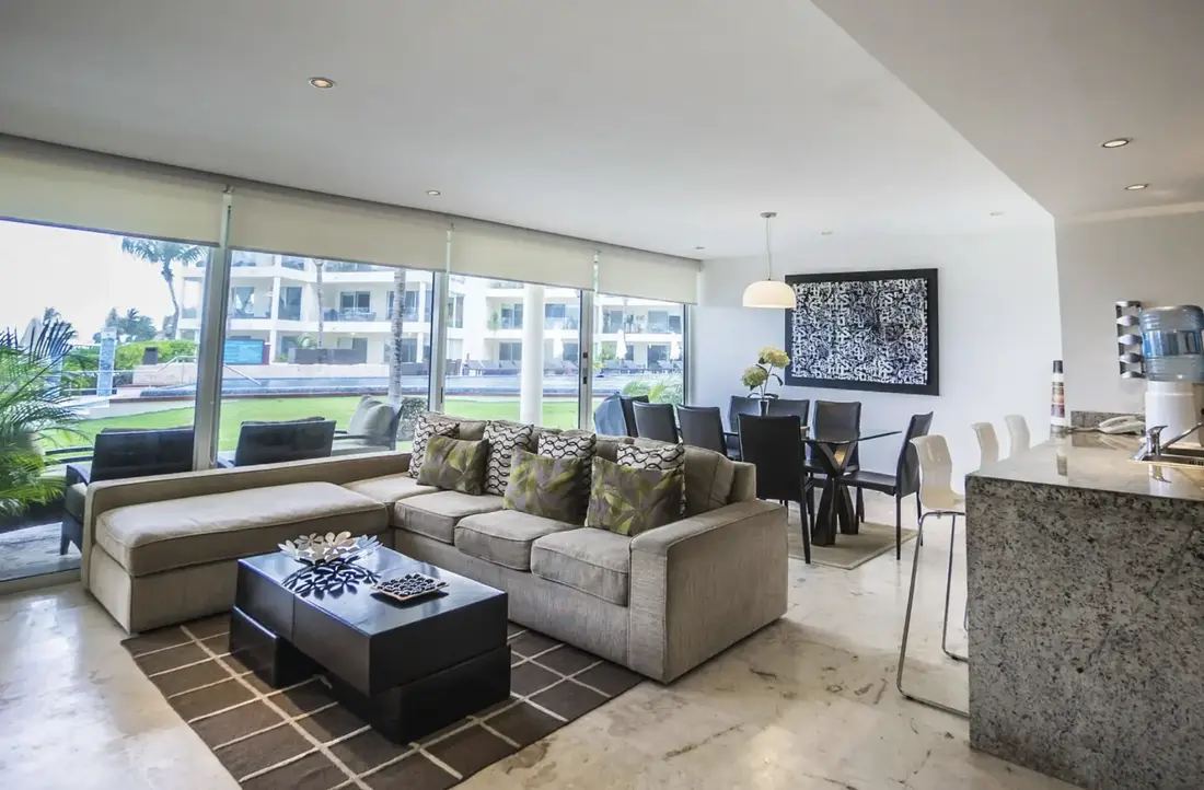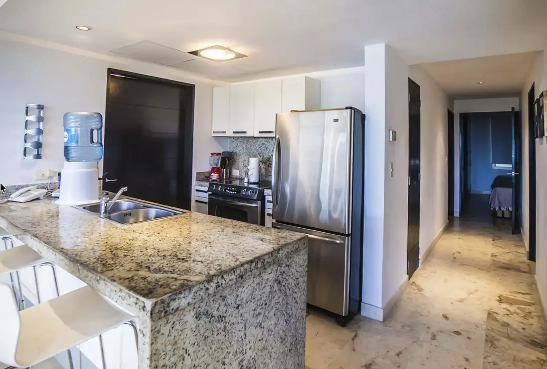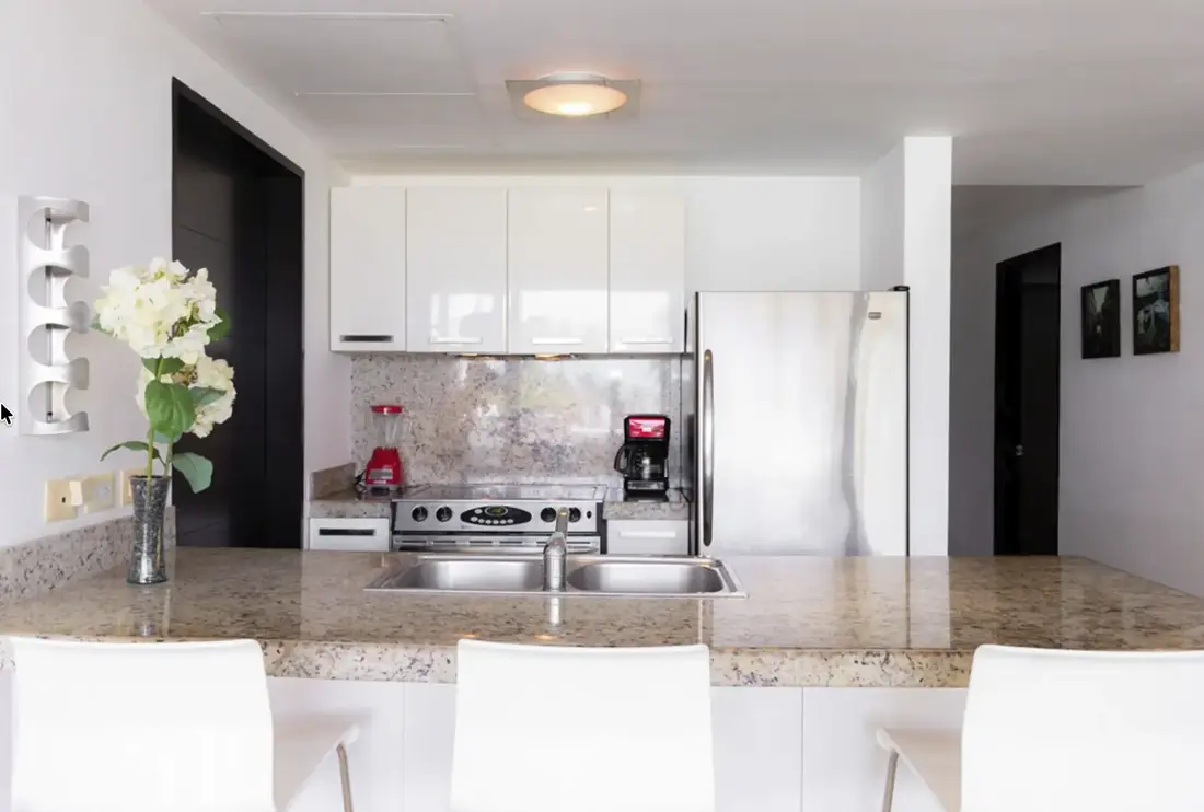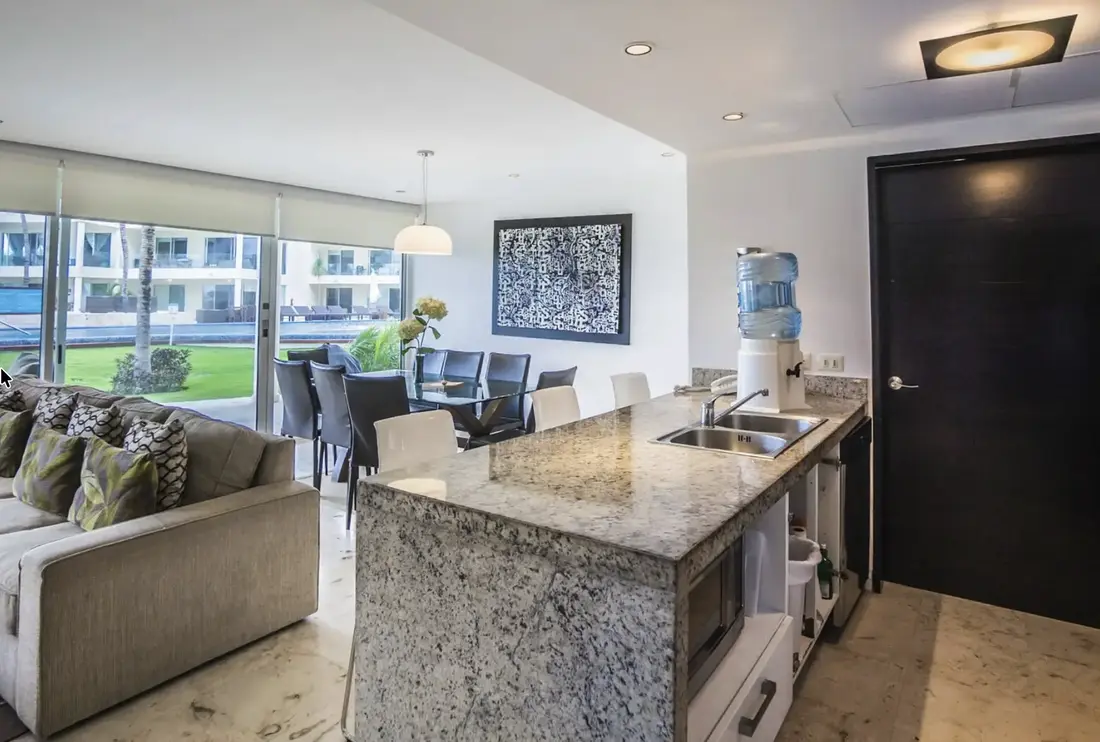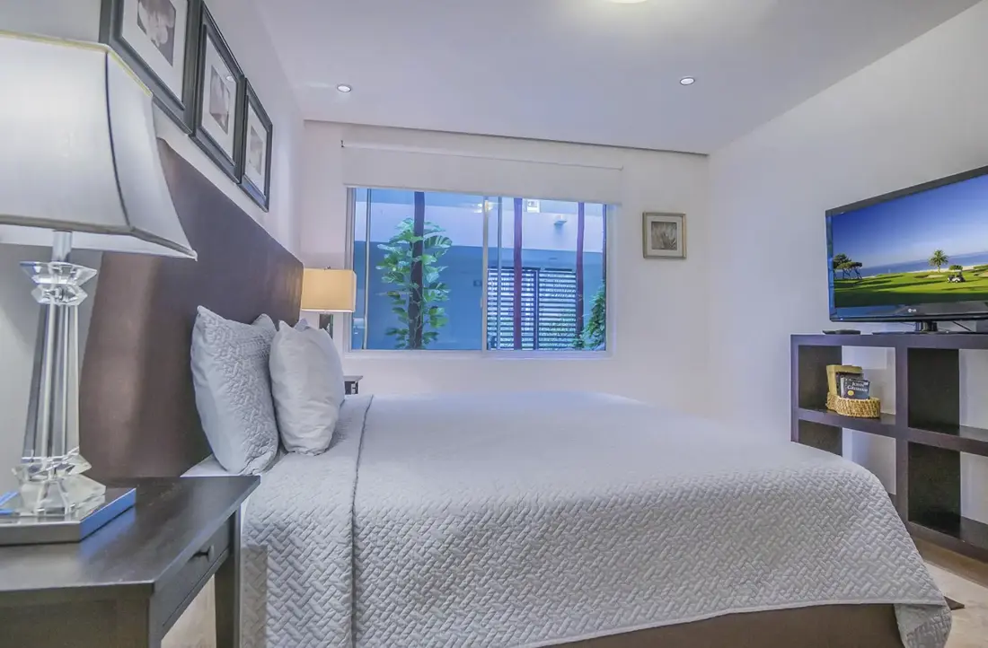 An entire wall of windows allow the glorious sunshine to illuminate the open-concept living space, highlighting the polished, natural stone floors and unique pieces of decor. A gorgeous dining table for 8, a fully-appointed kitchen, a sleek granite breakfast bar which accommodates 3 and a laundry room with washer/dryer are just a few of the aspects guests will appreciate in this paradisaical retreat. Other amenities include flat screen satellite TVs in every room, charcoal grill, iron, cooler, a 24 hour fitness facility and business center, adults-only jacuzzi area, parking and 24 hour security.