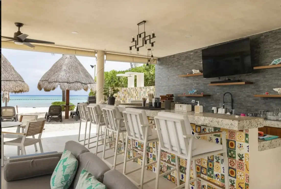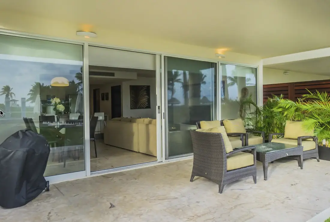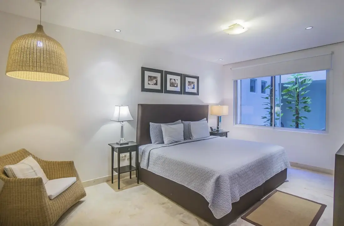 Garden House 21 incites guests to sink back into luxurious comfort with its elegant, dark wood furnishings, modern artwork, plush sectional couch and alluring terrace with sophisticated rattan seating area. This ample outdoor space sits at the front end of the immaculate property and showcases captivating views of the marvelous Caribbean Sea. Its optimal corner location grants guests direct access to the expansive, infinity pool and exclusive beach club across the way, while offering a serene atmosphere in which to savor a good novel or a romantic evening with your loved one.
