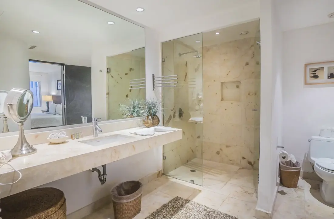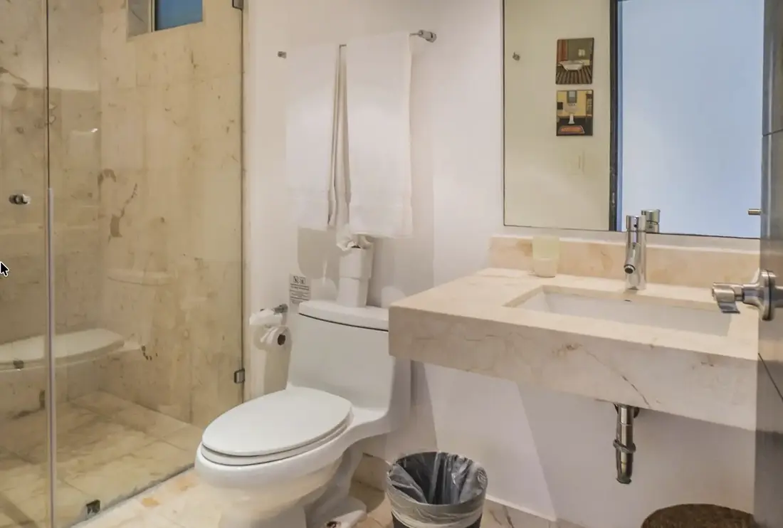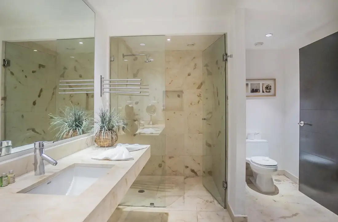 Both commodious bedrooms are professionally decorated and feature 2 double beds in the first with a nearby 3 piece bathroom, and a king size mattress enveloped in high thread count linens in the master. The marble en-suite is equipped with custom closets, a rain shower head, safe, hairdryer and premium organic toiletries.