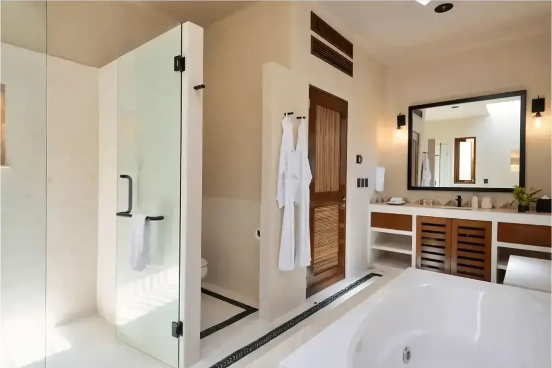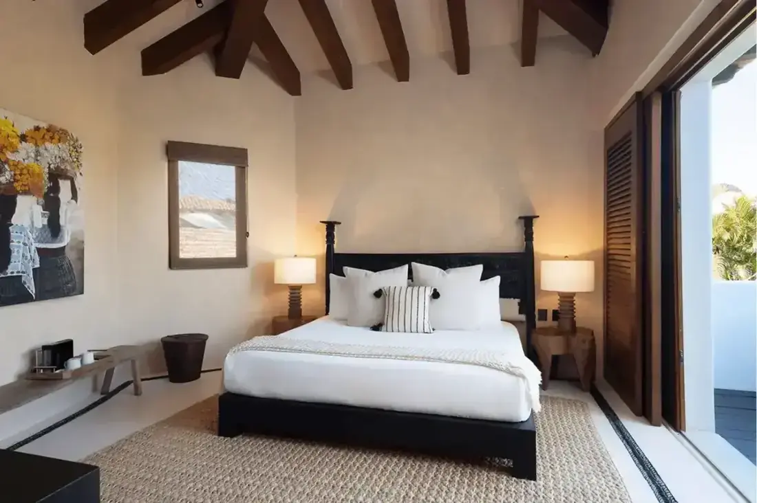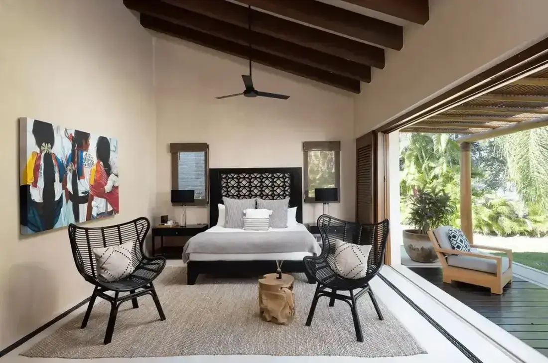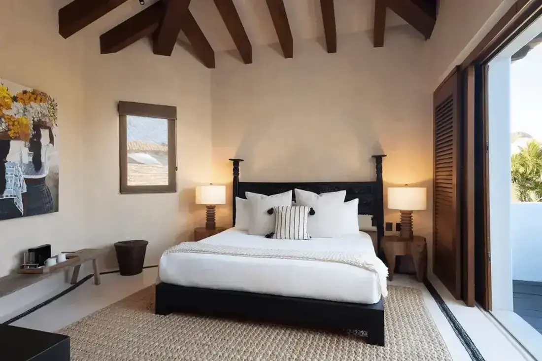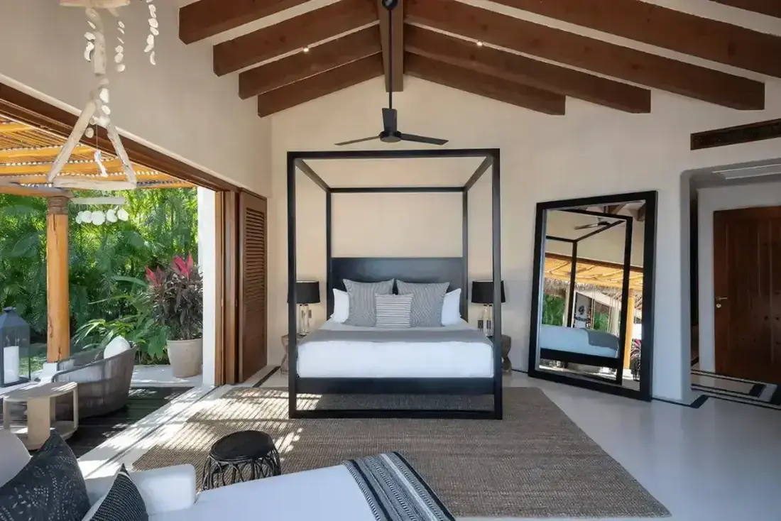 - Master Suite (Patrona Guest) – King bed, ocean terrace, tub + shower, A/C, fan, coffee maker, minibar, organic toiletries, robes, satellite TV, Wi-Fi