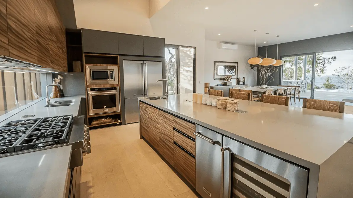 The Residence The open-plan living and dining areas open directly onto the pool terrace, creating a sprawling social hub overlooking the Pacific. Spend your afternoons at the private outdoor bar or soaking in the heated infinity pool. As evening falls, gather around the stunning fire pit to watch the sunset over the bay. For indoor relaxation, the basement-level home cinema provides a perfect, shaded retreat for movie nights or relaxing away from the afternoon sun.