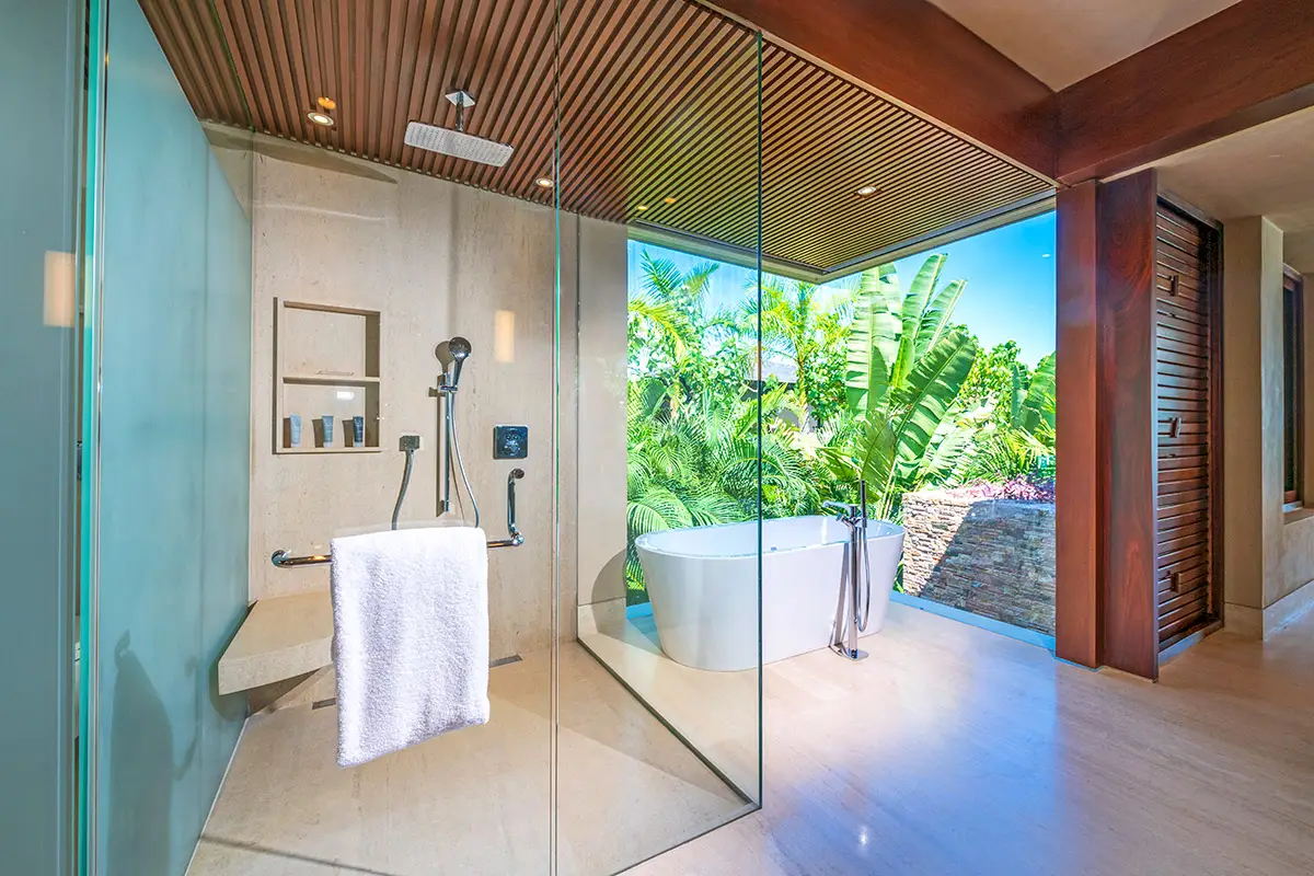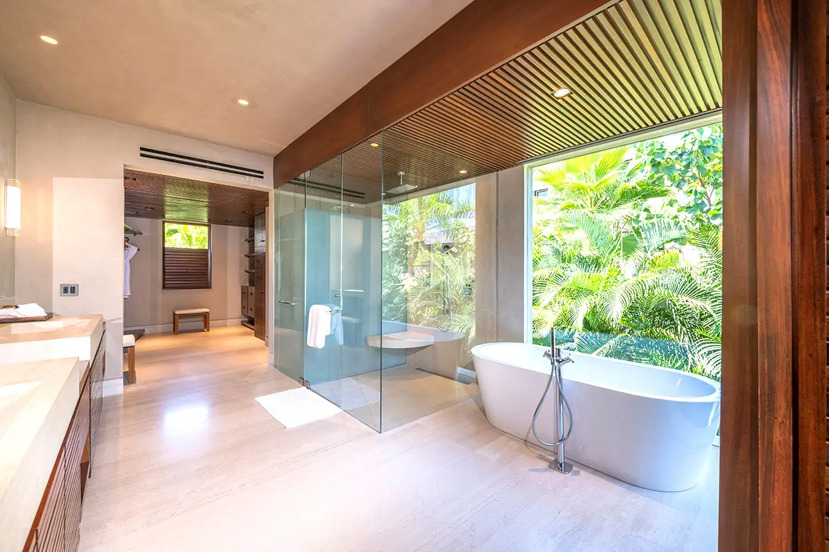 Master Suite 1: King bed, private ocean-view terrace, deep soaking bathtub, and elevator access.
