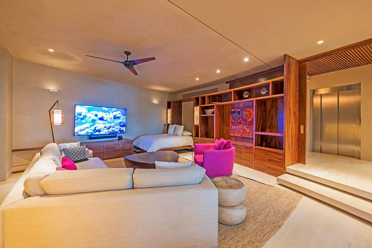 The Residence The villa features an open-concept living and dining area with floor-to-ceiling glass walls that disappear to merge with the expansive terraces. The state-of-the-art gourmet kitchen is complemented by professional-grade social spaces, including a media room with a premium entertainment system and an outdoor fire pit area for evening gatherings. Unique to this estate are two elevators and a private gym, ensuring accessibility and wellness are at the forefront of your stay.