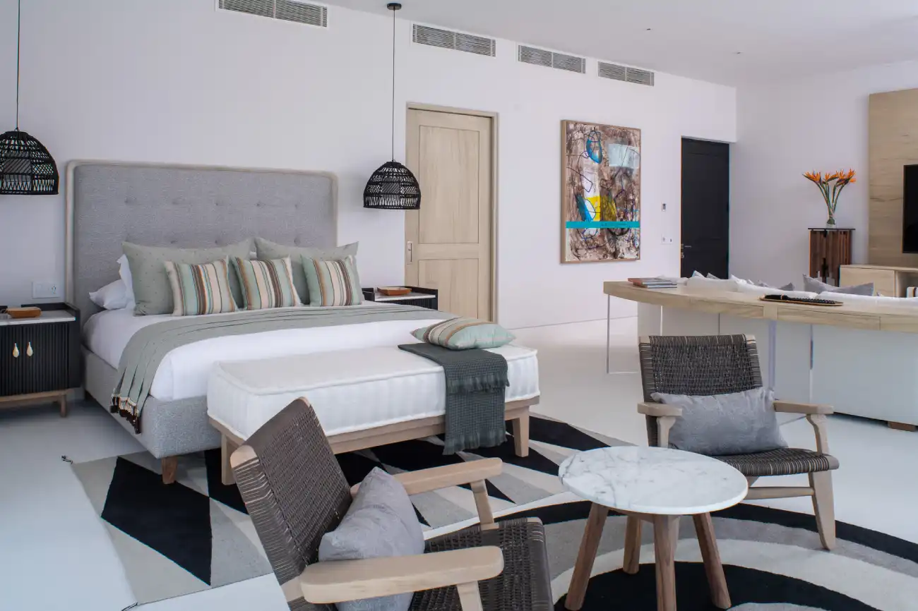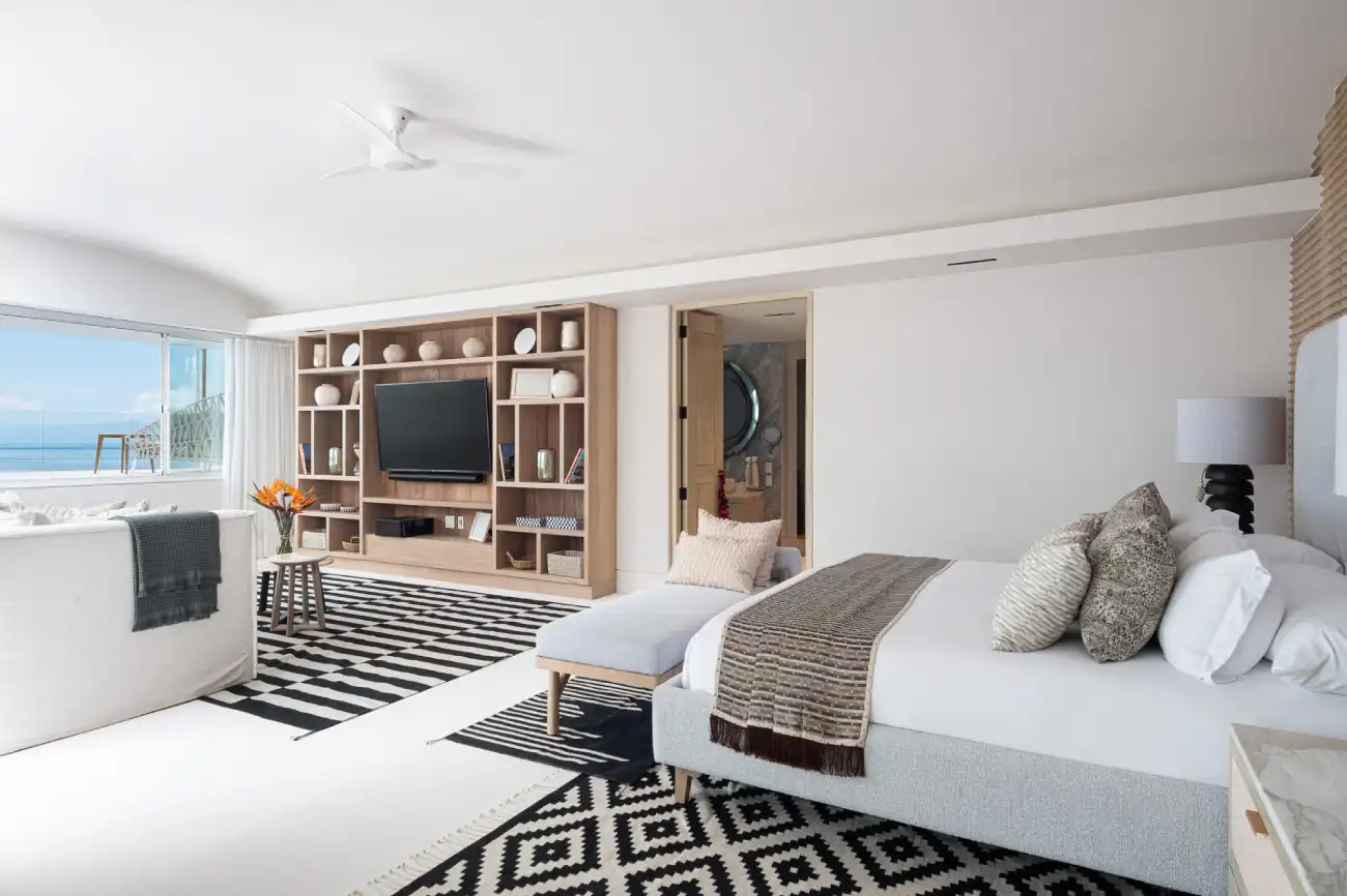 Master Suite 1: King bed, oceanview, private terrace, sitting area, and desk.