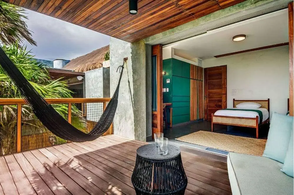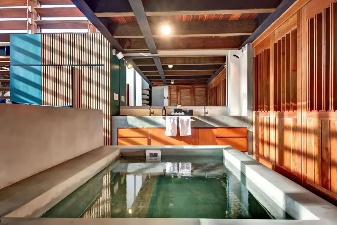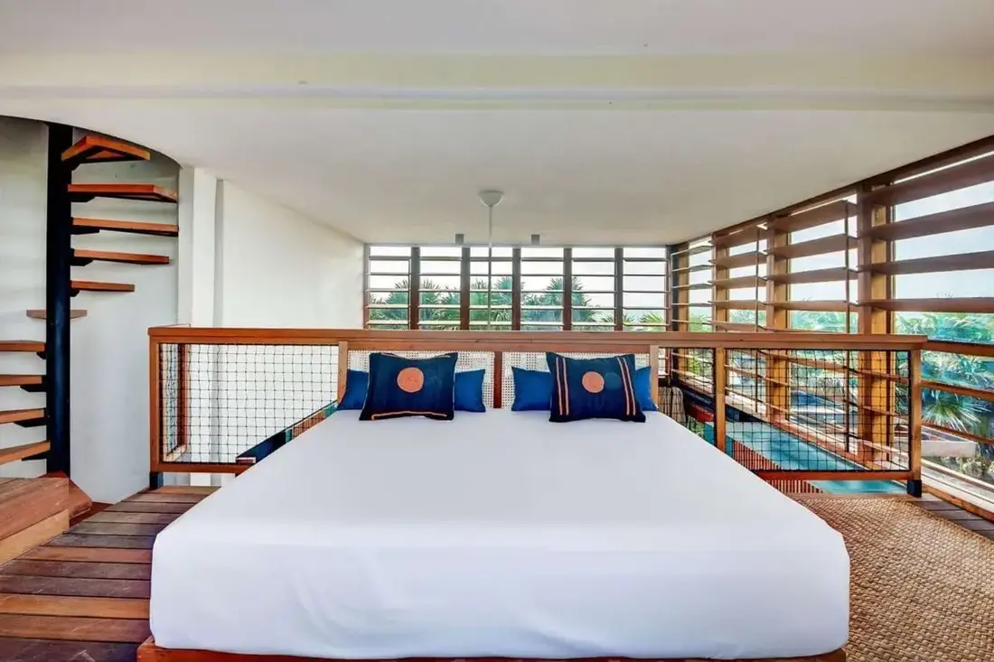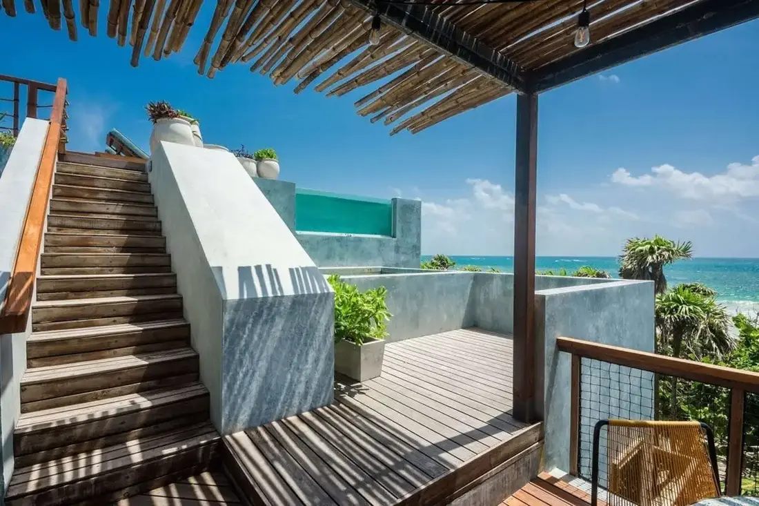 Beyond the main palapa, the natural dunes, with their palm trees and snug hammocks, are the prelude to a breathtaking private stretch of white sand beach. Climb onto the top level and you’ll find mesmerizing 360-degree views of the 4.5-acre property, with the lagoon on one side and the Caribbean Sea on the other. The rooftop deck, an ideal spot for morning yoga and watching spectacular sunsets, also boasts an infinity pool where you can spend hours relaxing and contemplating the ocean.