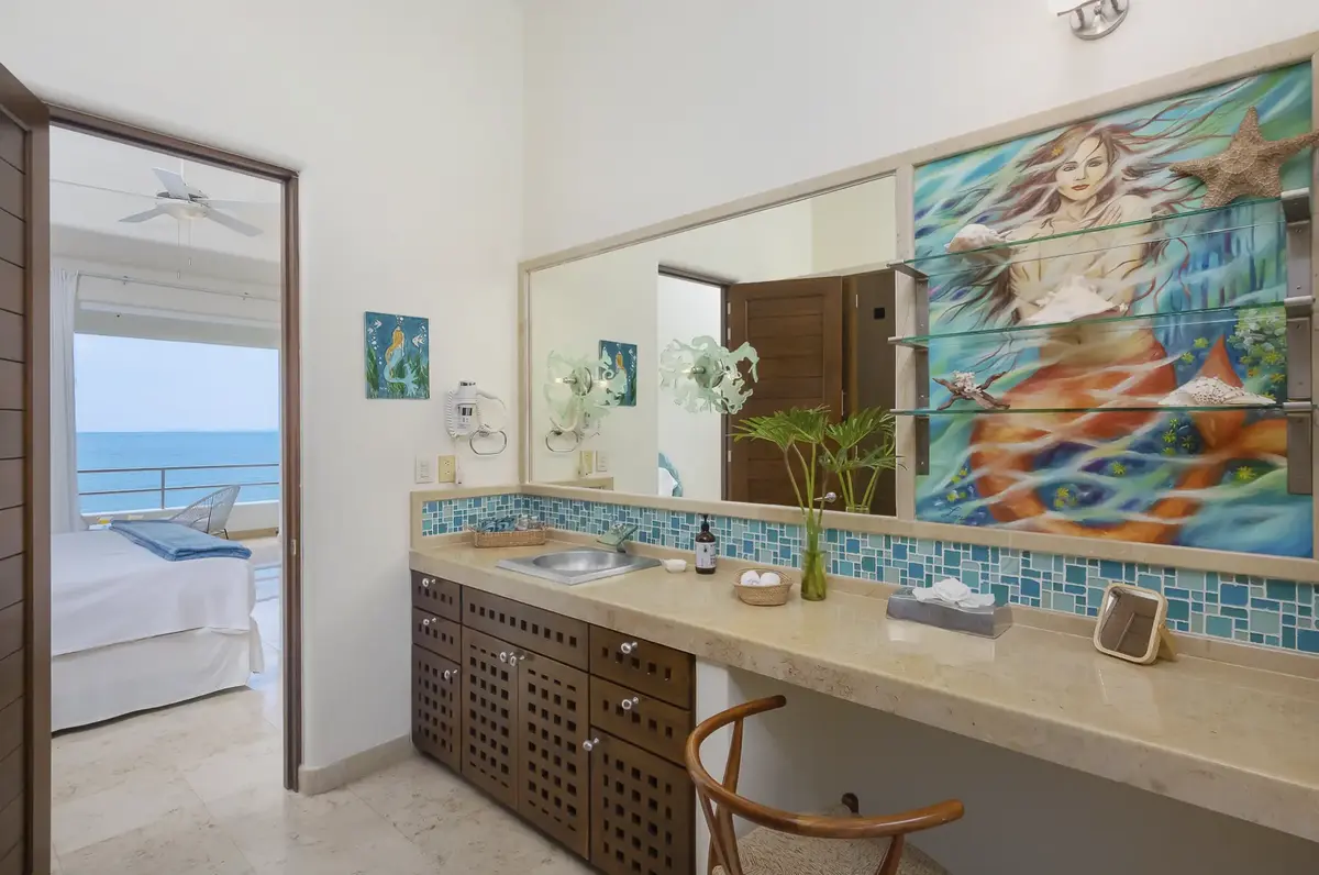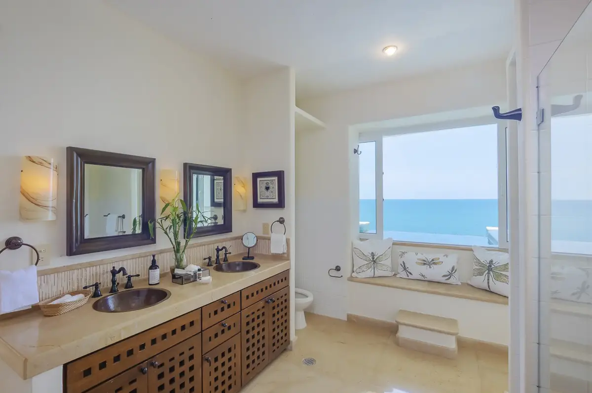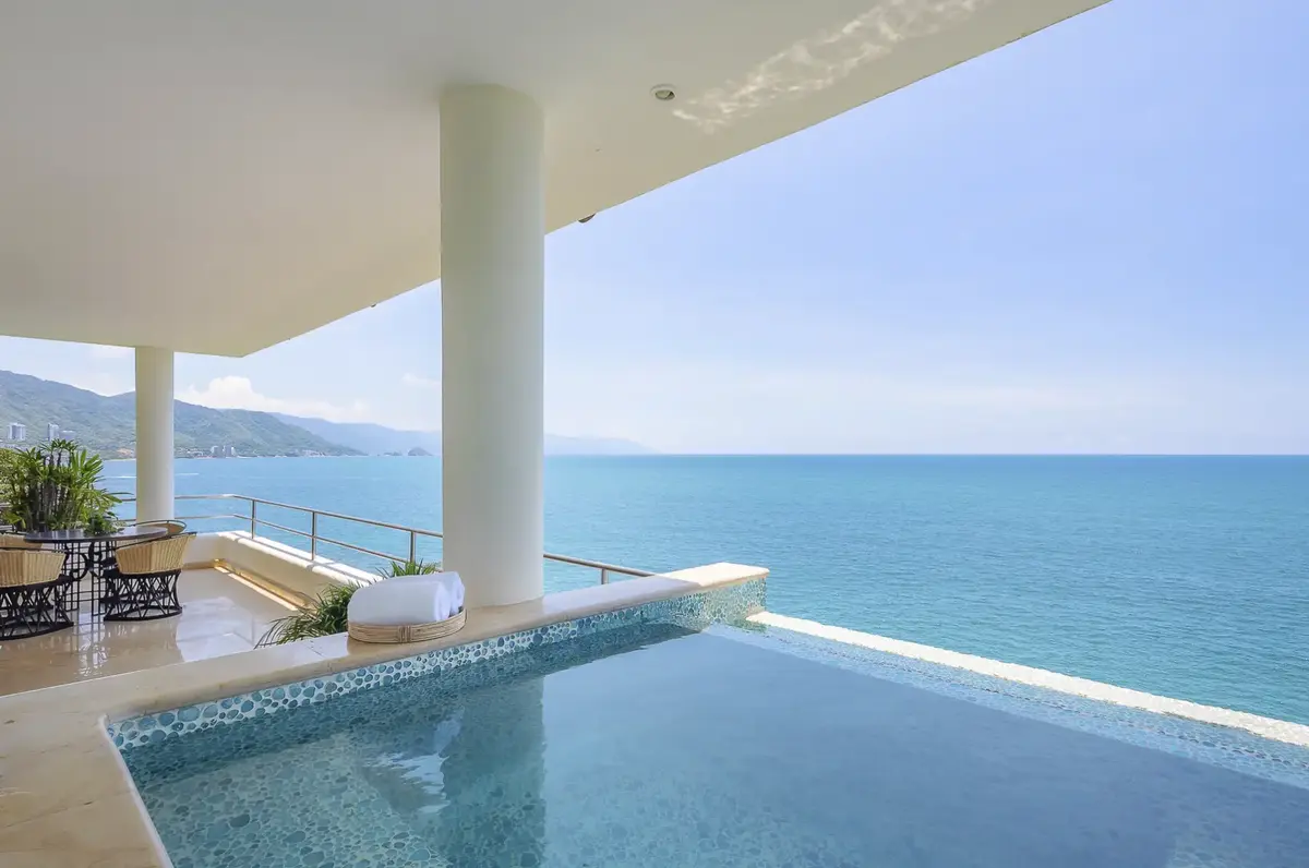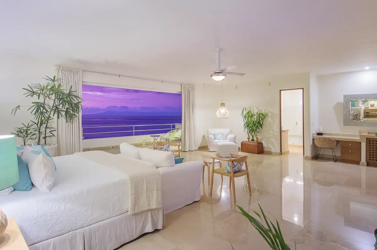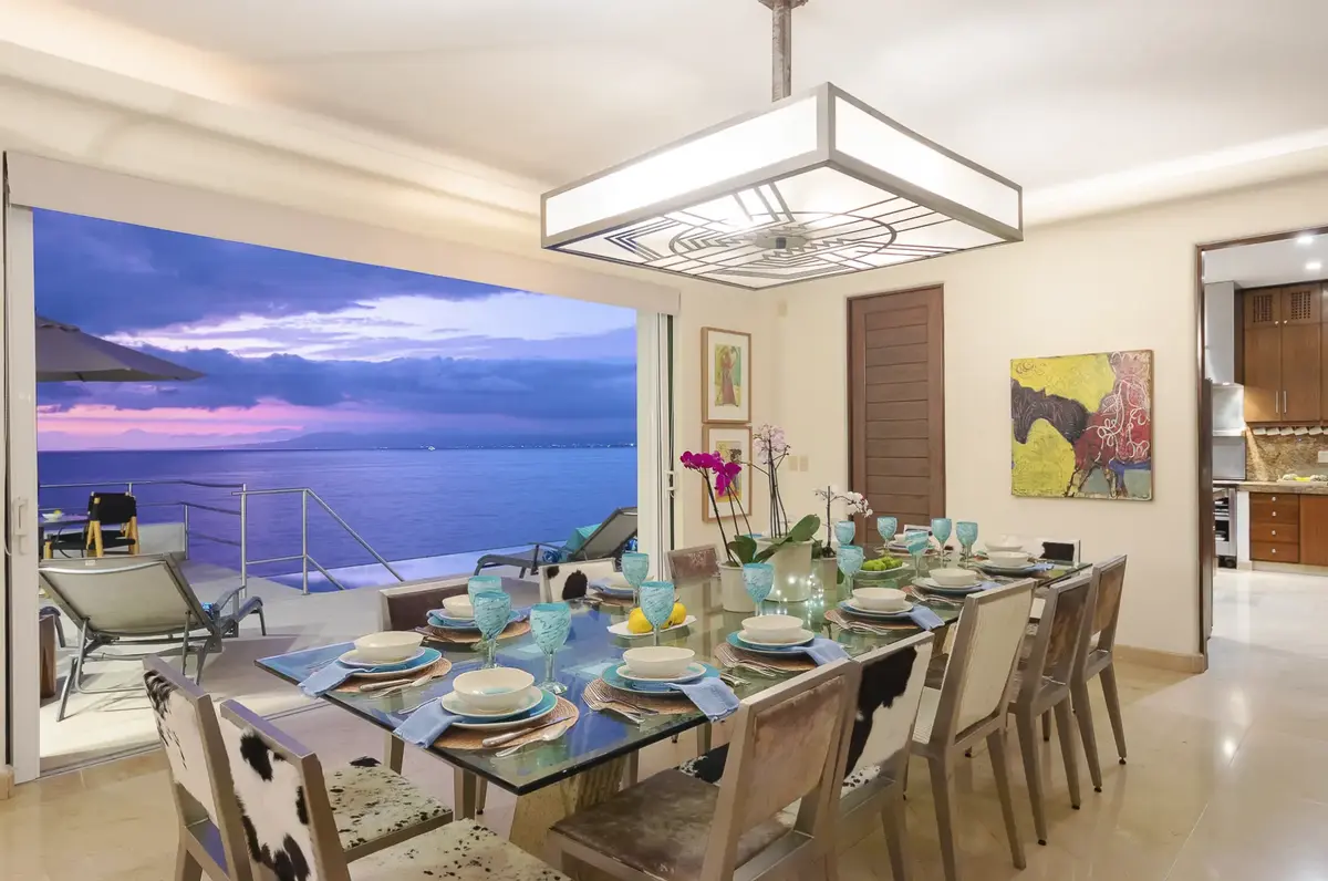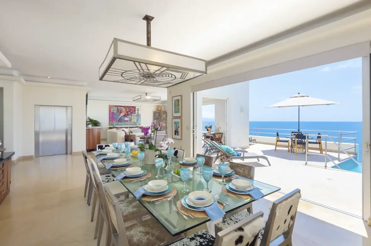 The clean elegant lines of Oceanfront Bal House Puerto Vallarta are juxtaposed with organic details, splashes of bright tropical colors, and some of the best local artists work, giving a sophisticated ambiance embracing the flavor of Mexico. The spacious villa has nine plus bedrooms, sleeps up to 20 persons, and is a perfect place for families, and groups of friends reconnecting or celebrating a milestone birthday or anniversary as well as corporate and wellness retreats. The villa includes all the comforts and amenities from an elevator, and a private screening room, most bedrooms have ocean views and terraces.