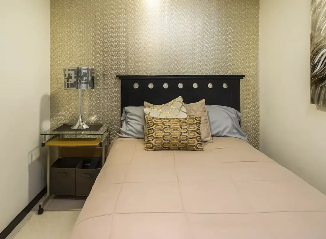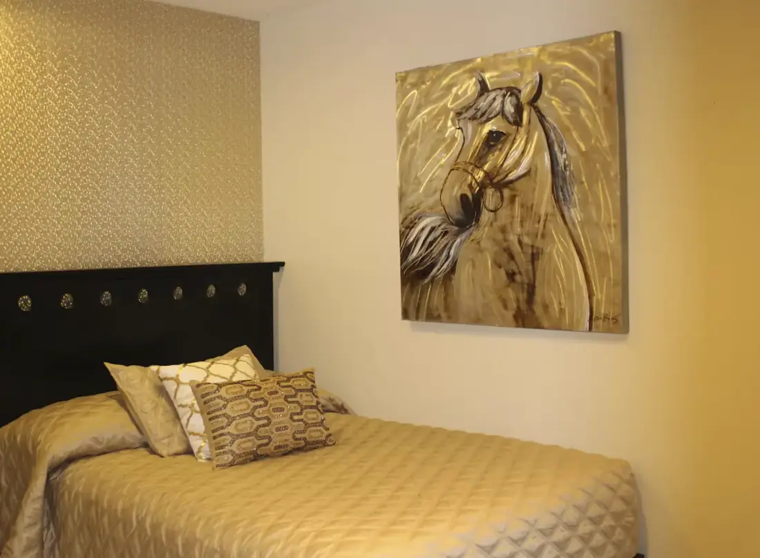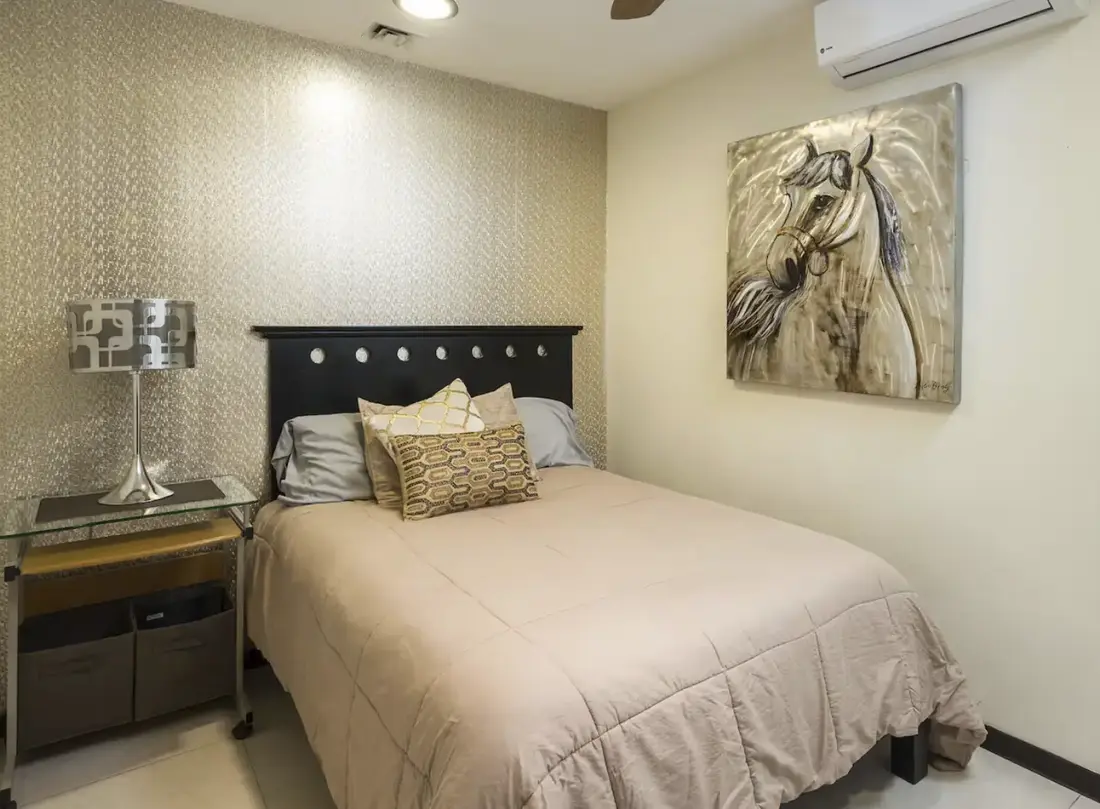 Fourth Bedroom: The owners’ favorite! A quiet, beautifully textured, and cozy room with a double (full) bed and an adjacent bathroom.