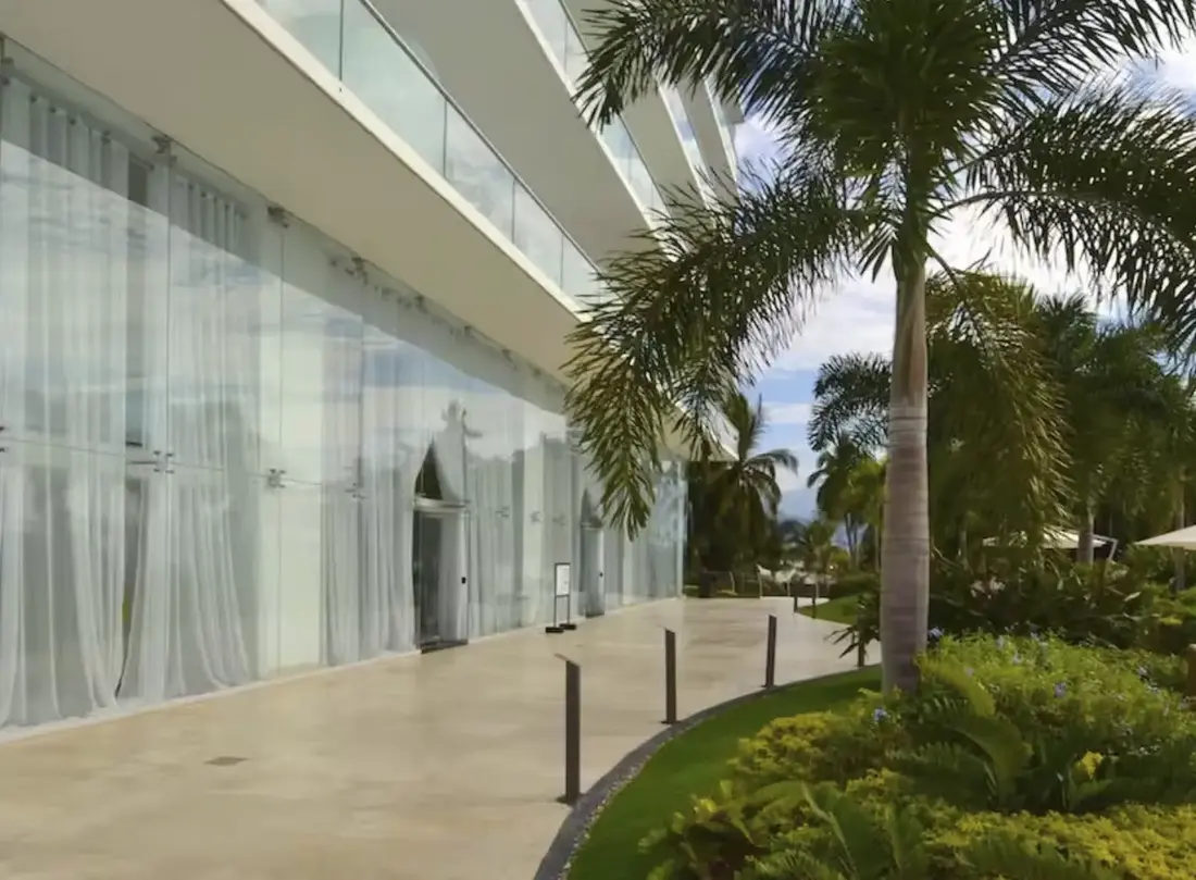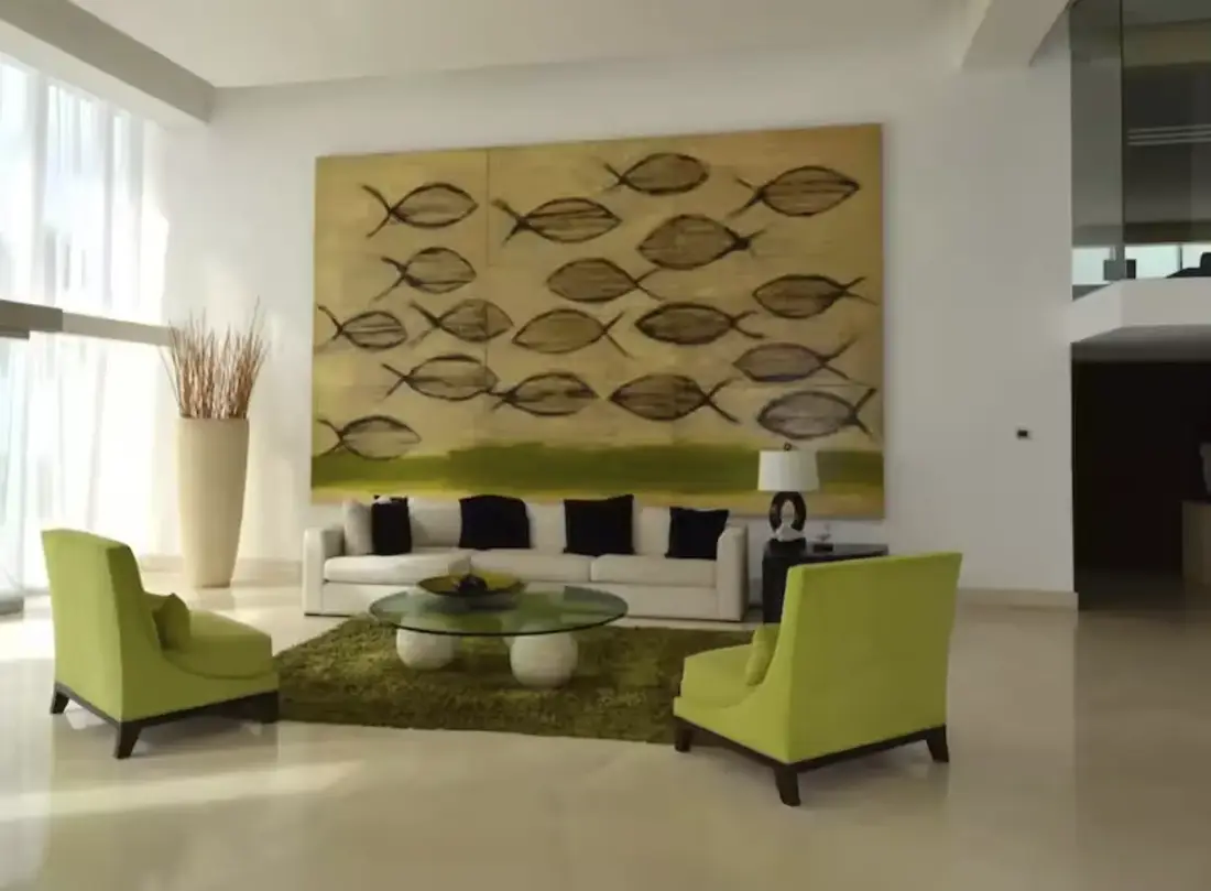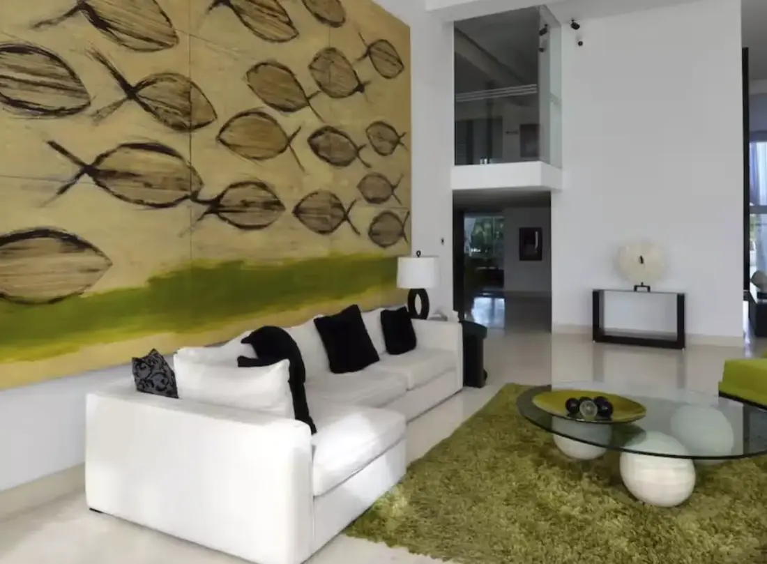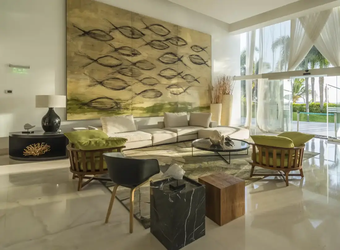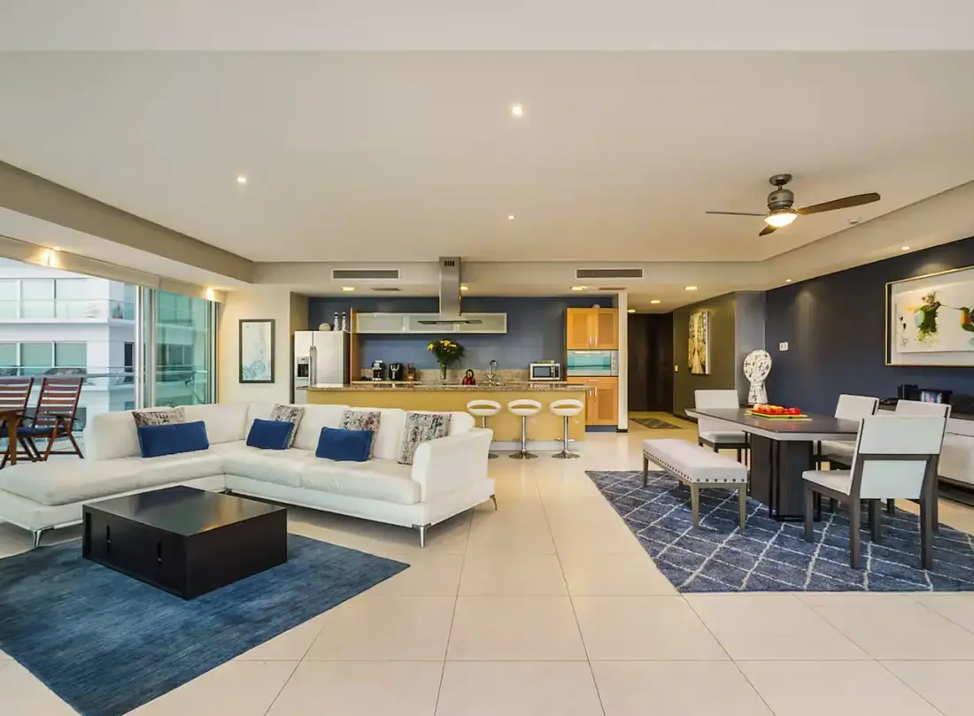 Spanning an impressive 3,300 square feet across the entire length of the building, this unit is situated on the cooler north side, allowing for a wonderful cross breeze. The gigantic living room features a large L-shaped sofa and opens up to extra-large balconies on two sides, making the space feel as if it seamlessly blends into the pool and the ocean.
