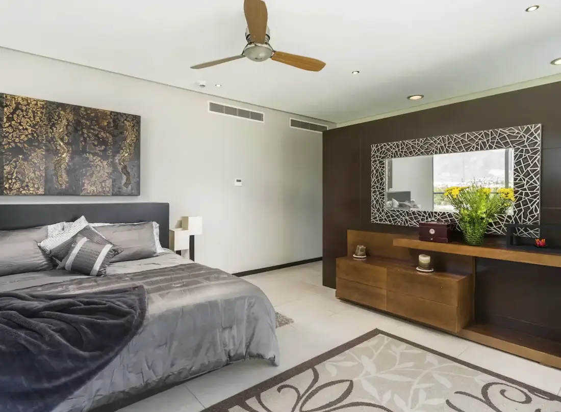 Master Suite: A massive retreat offering fantastic ocean and mountain views with large balconies on two sides. It includes a spacious double vanity, a large closet, a walk-in shower, and a deep soaking tub.