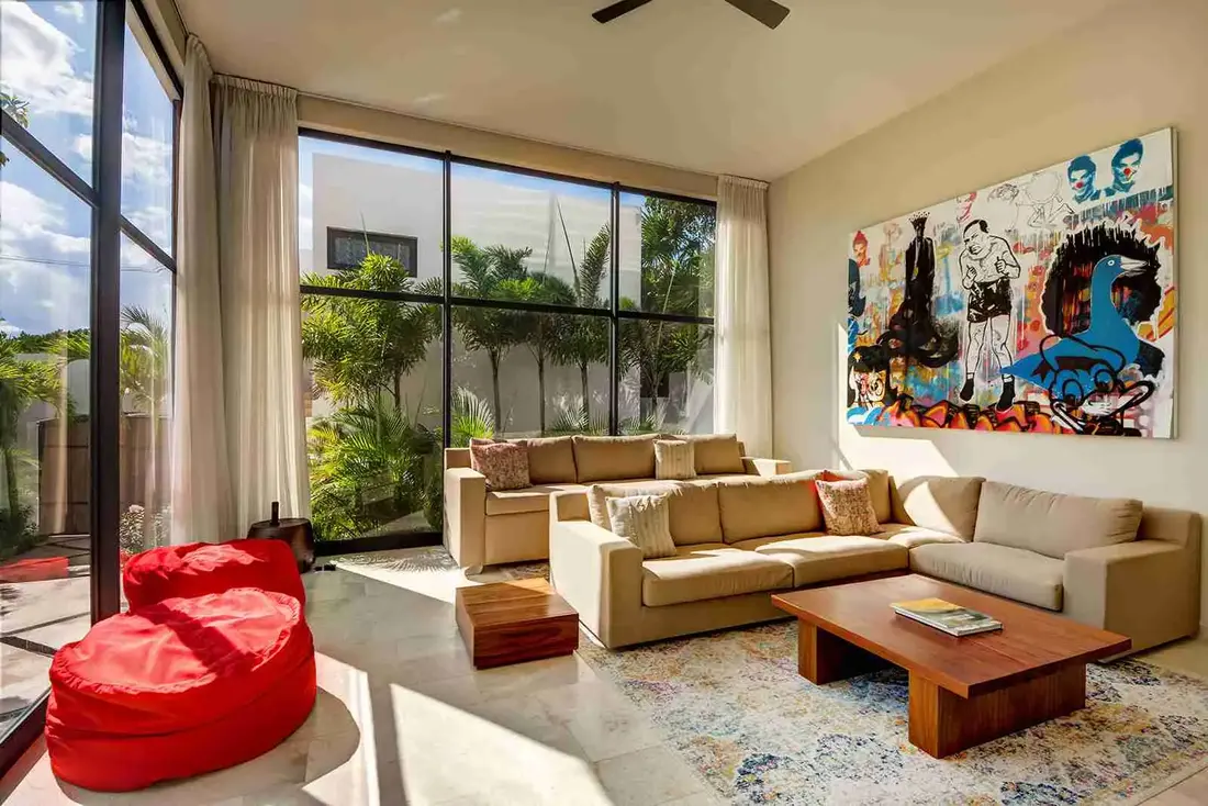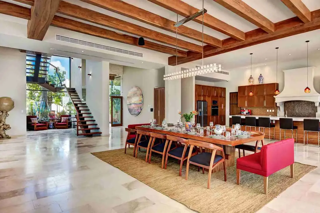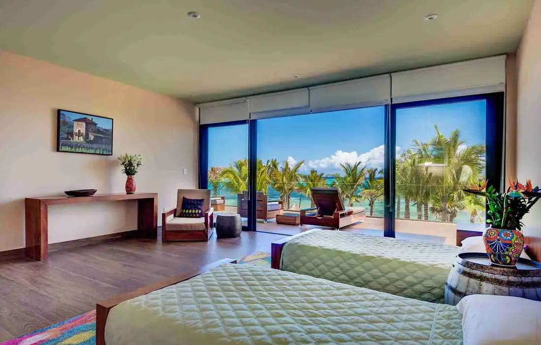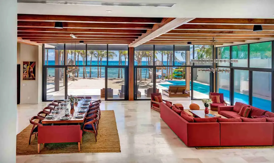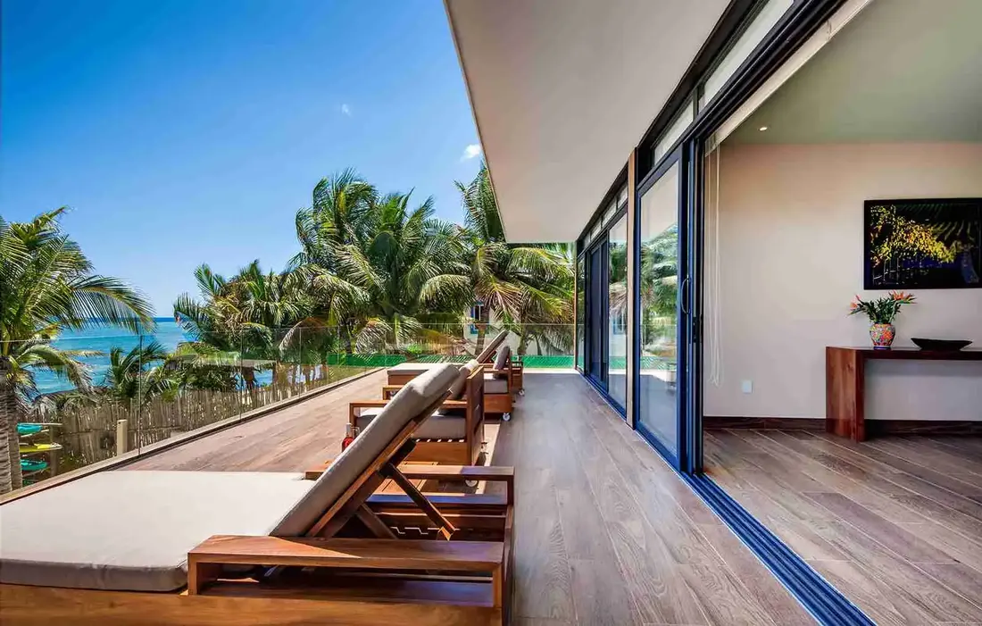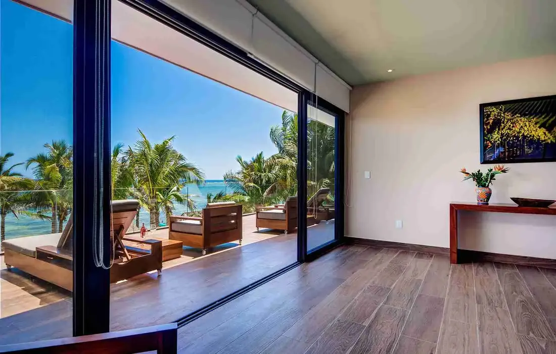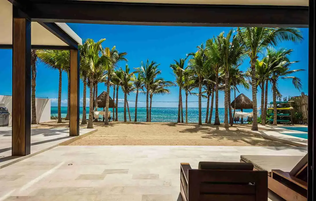 Inside, modern Mexican architecture blends seamlessly with the relaxed beachfront lifestyle. Crisp black and white interiors and sleek lines contrast beautifully with the lush greenery, mature palms, and warm coastal setting. Large open doors and windows let in refreshing sea breezes and natural sunlight, creating an airy, inviting atmosphere throughout the home.