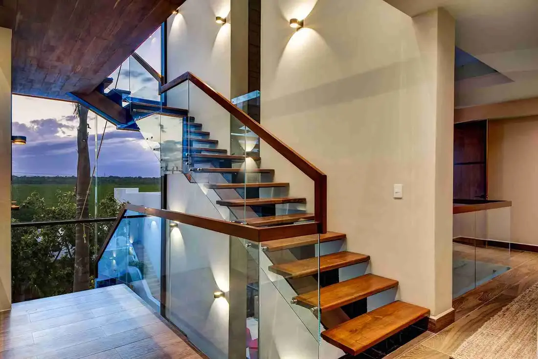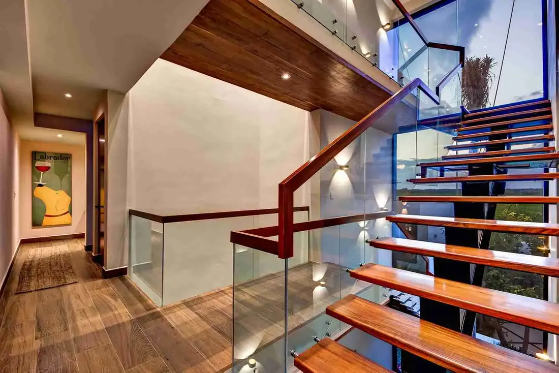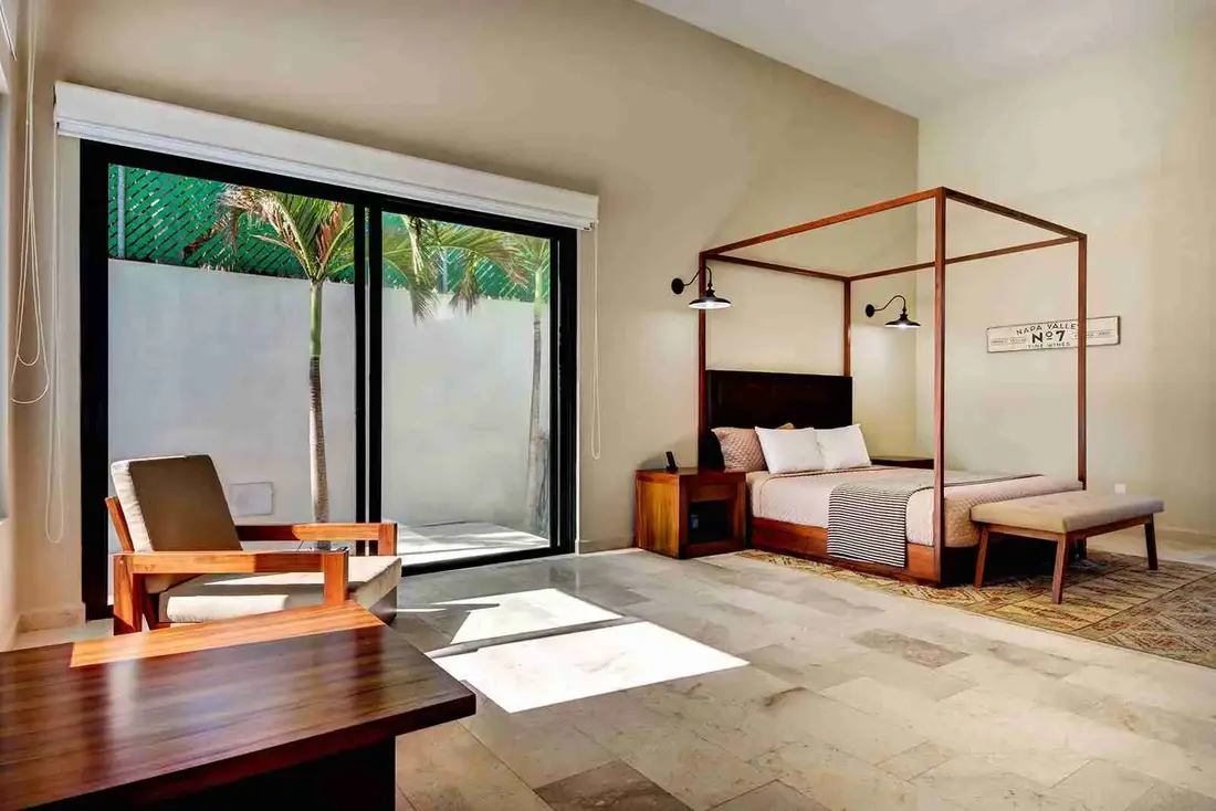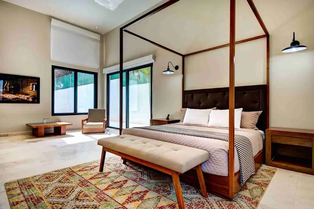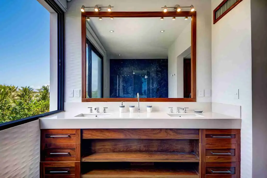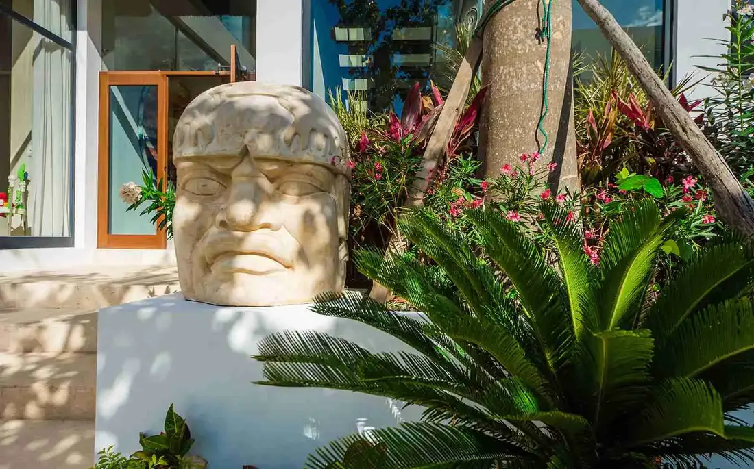 Inside, modern Mexican architecture blends seamlessly with the relaxed beachfront lifestyle. Crisp black and white interiors and sleek lines contrast beautifully with the lush greenery, mature palms, and warm coastal setting. Large open doors and windows let in refreshing sea breezes and natural sunlight, creating an airy, inviting atmosphere throughout the home.