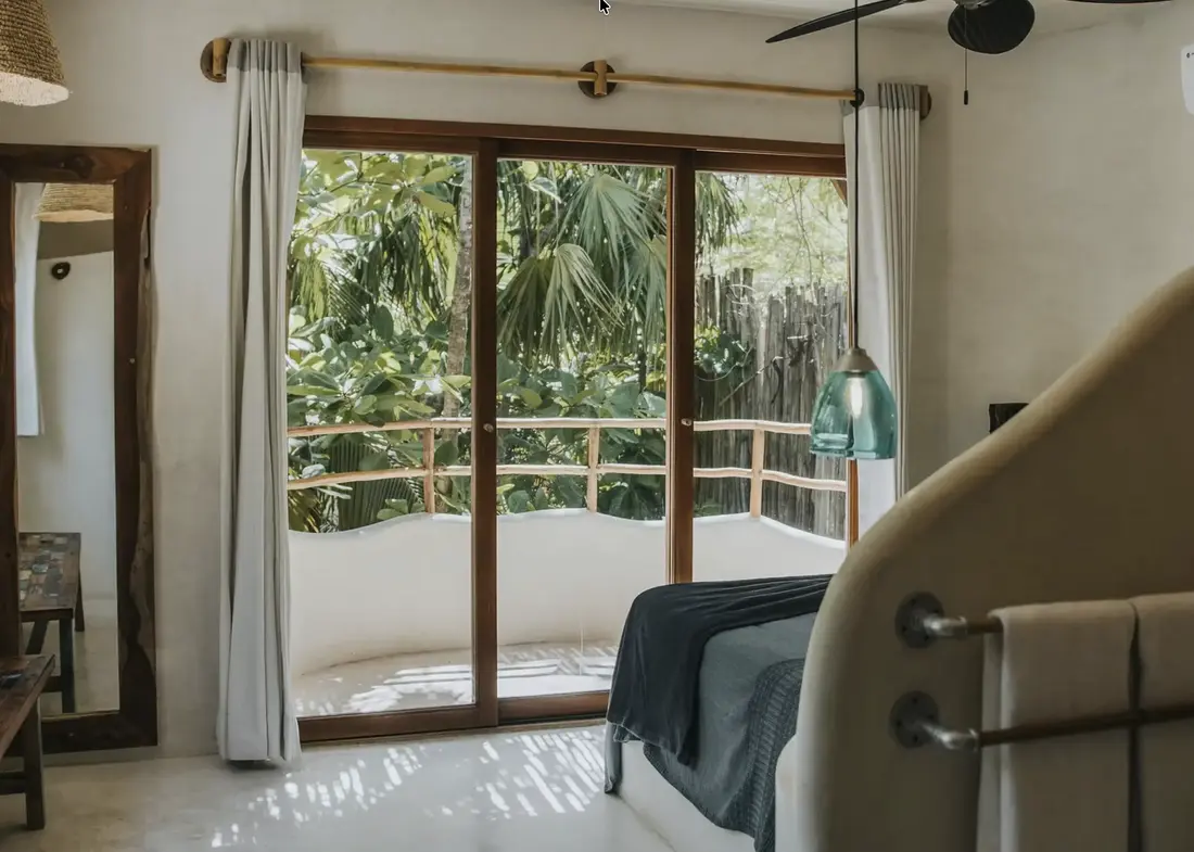 - Bedroom 3 (Upper Level) – Queen-size bed, ensuite bathroom, Juliette balcony, jungle vibe