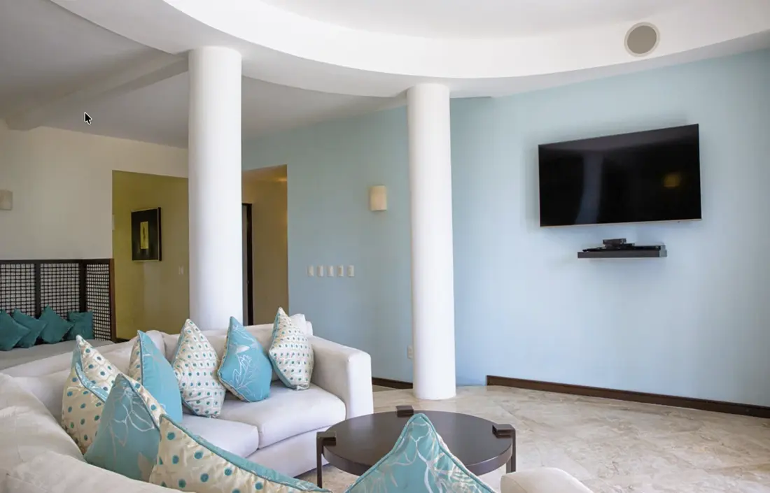 - Master Bedroom (Upper Floor) – King-size bed, ensuite bathroom with shower & Jacuzzi bathtub, walk-in mahogany closet, lounge area, flat-screen TV, private palapa-covered terrace with infinity pool, ocean views