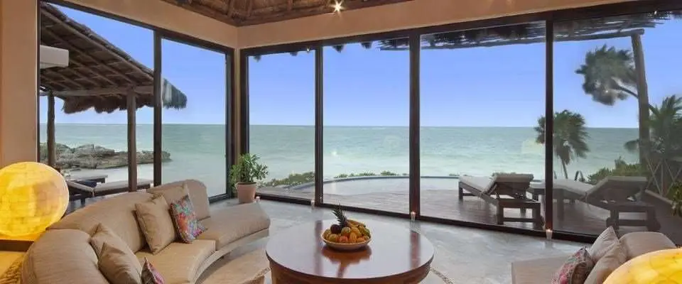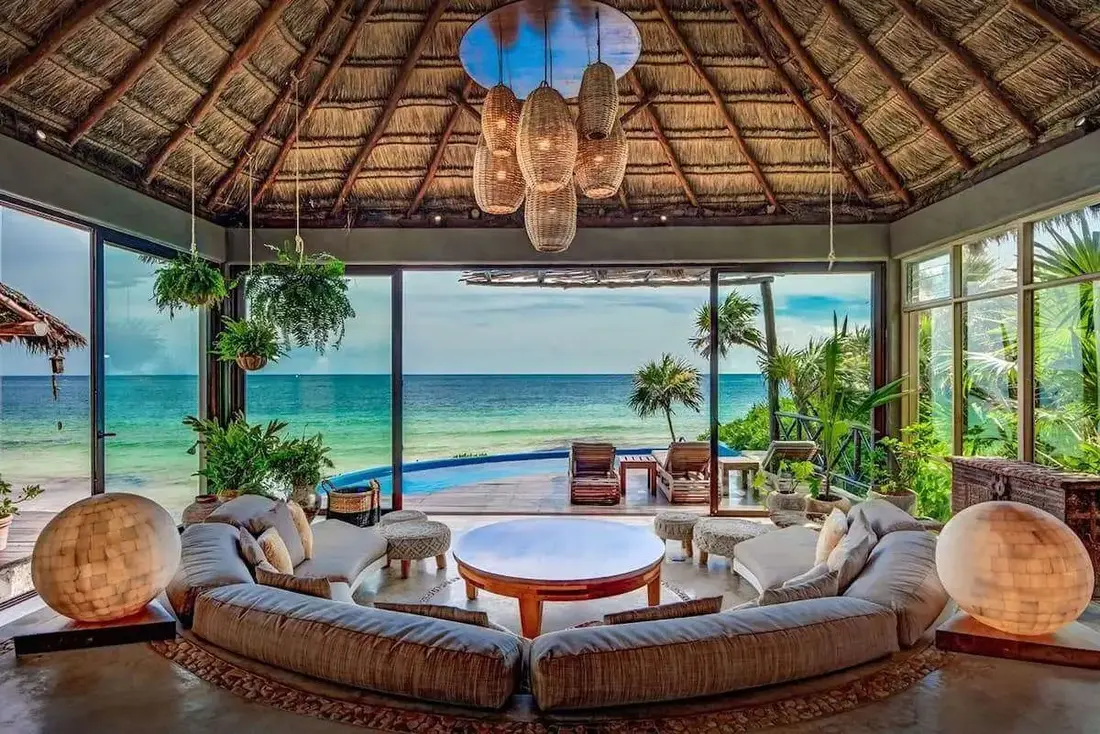 An incredibly beautifully constructed villa featuring a grand palapa front room with wall-to-wall panoramic views of the beach and sea. The Villa is irrefutably a vision from the heavens. This extraordinary oceanfront home is situated along the coastal beach road, just one-and-a-half miles south of the cliffside ancient Mayan ruins of Tulum and within walking distance of some of Tulum’s top restaurants.